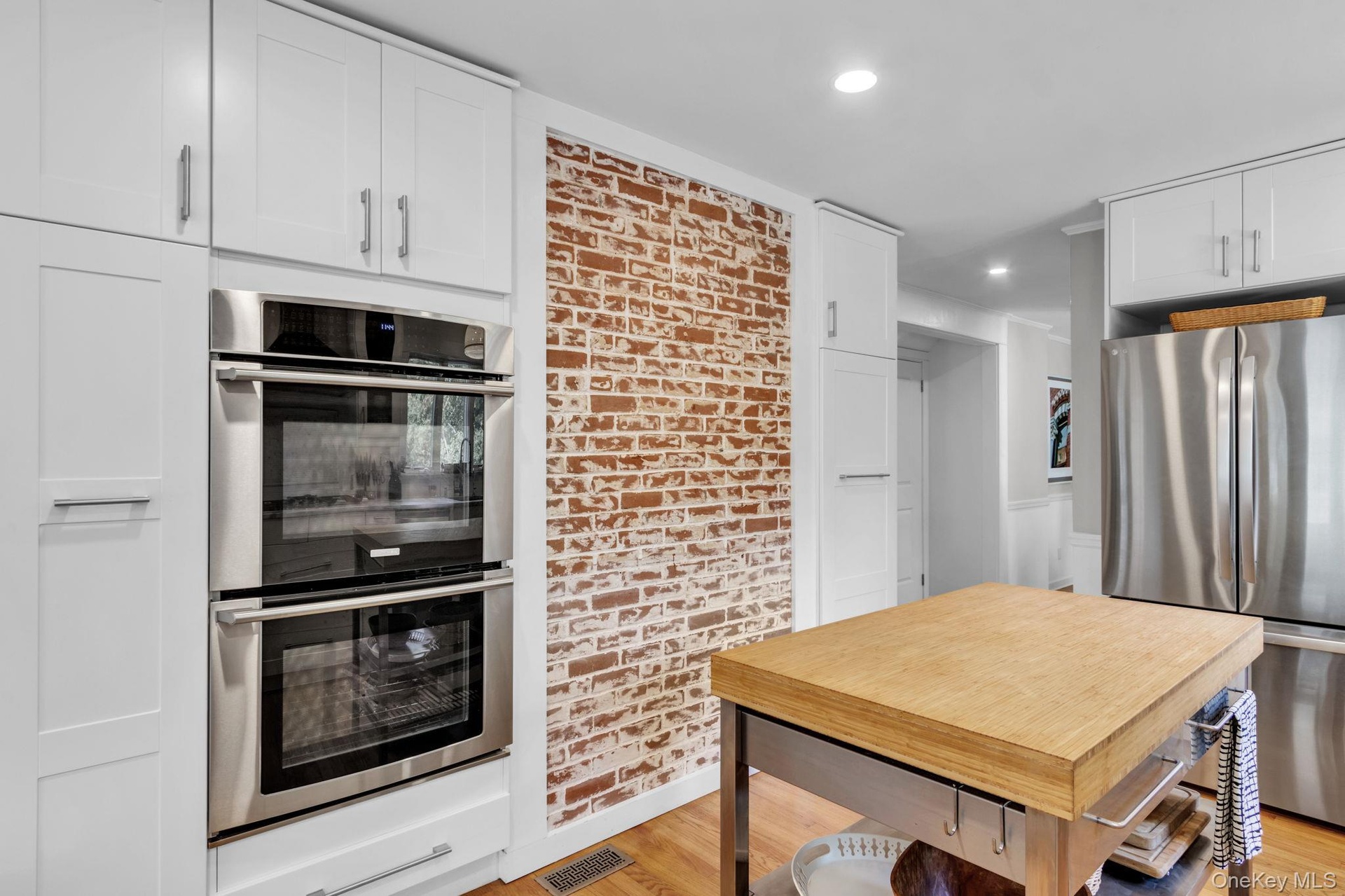 - Kitchen featuring brick wall, appliances with stainless steel finishes, light wood-type flooring, white cabinetry, and recessed lighting