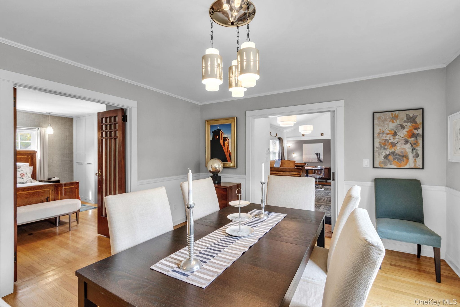 - Dining area with light wood-type flooring, a chandelier, ornamental molding, and a wainscoted wall