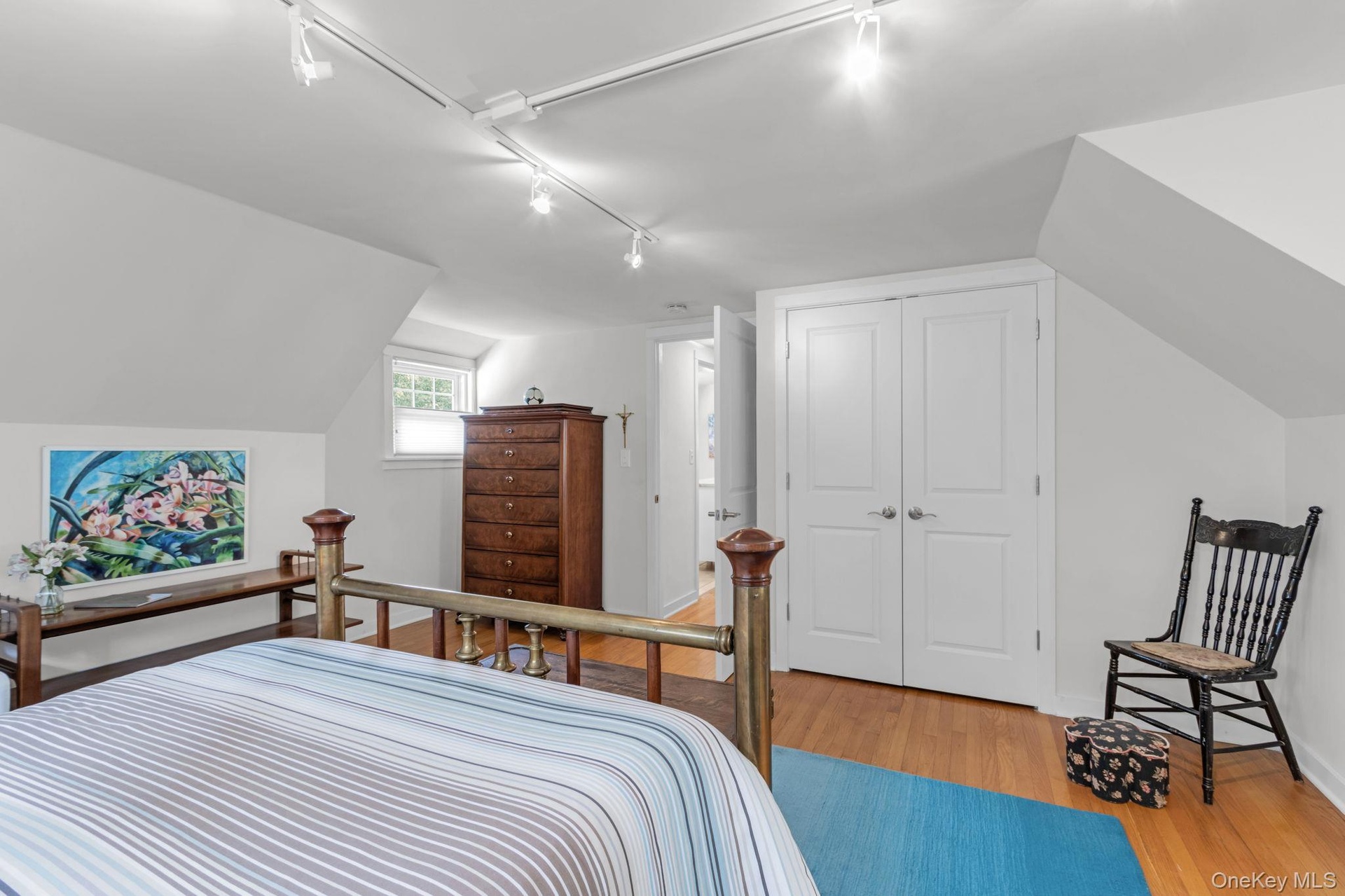 - Bedroom with rail lighting, vaulted ceiling, wood finished floors, and a closet