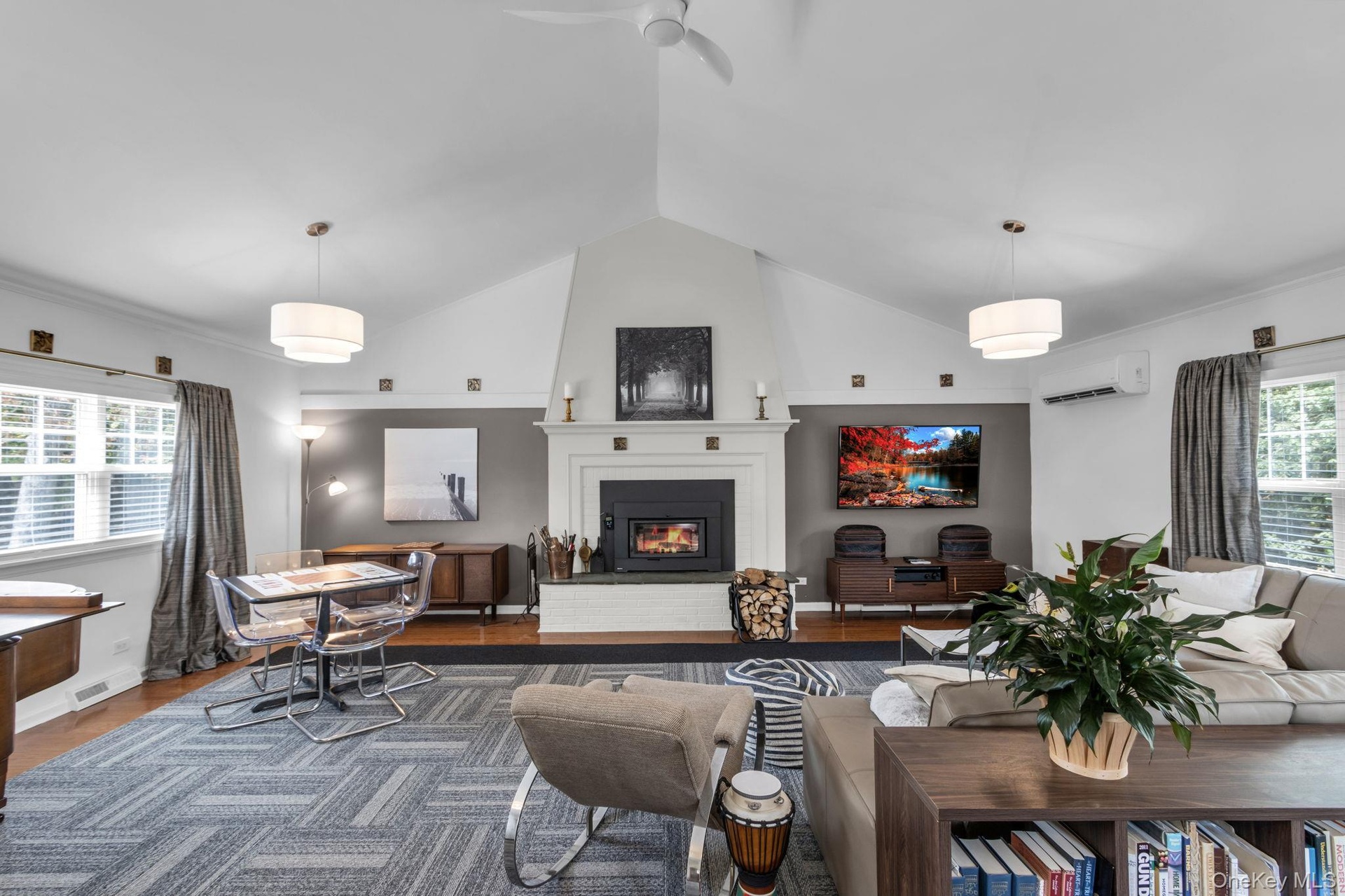 - Living area with vaulted ceiling, a large fireplace, wood finished floors, and an AC wall unit