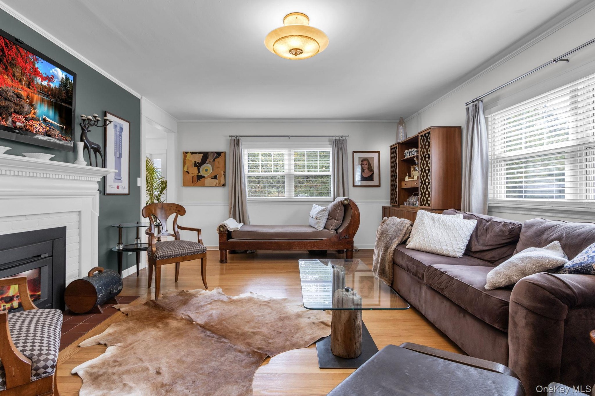 - Living room featuring wood finished floors, crown molding, and a brick fireplace