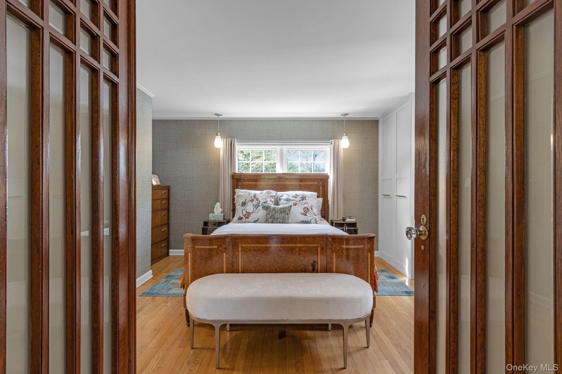 - Bedroom featuring wood finished floors, wallpapered walls, and ornamental molding