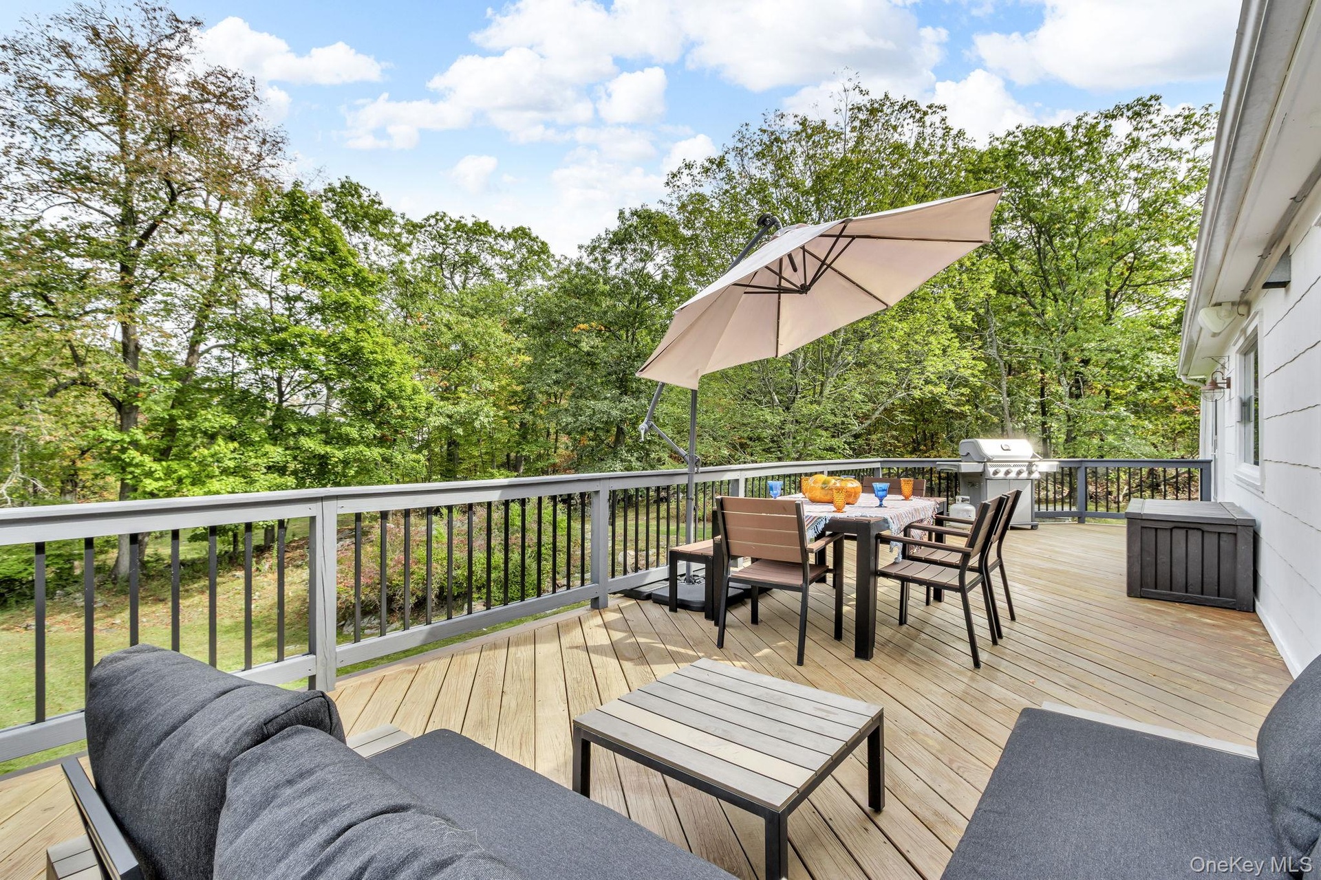 - Deck featuring outdoor dining area, view of wooded area, and grilling area
