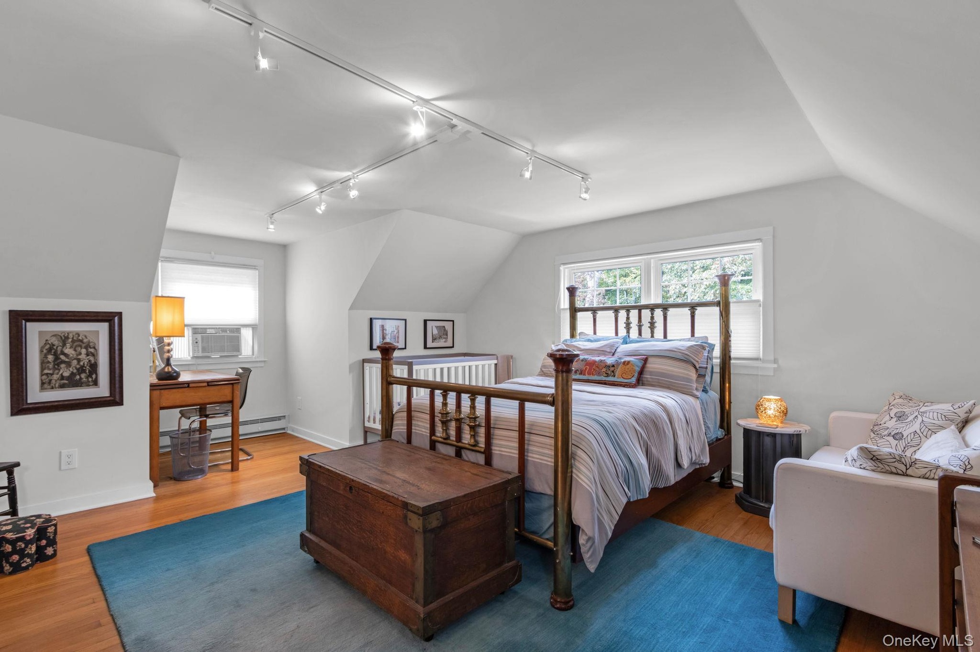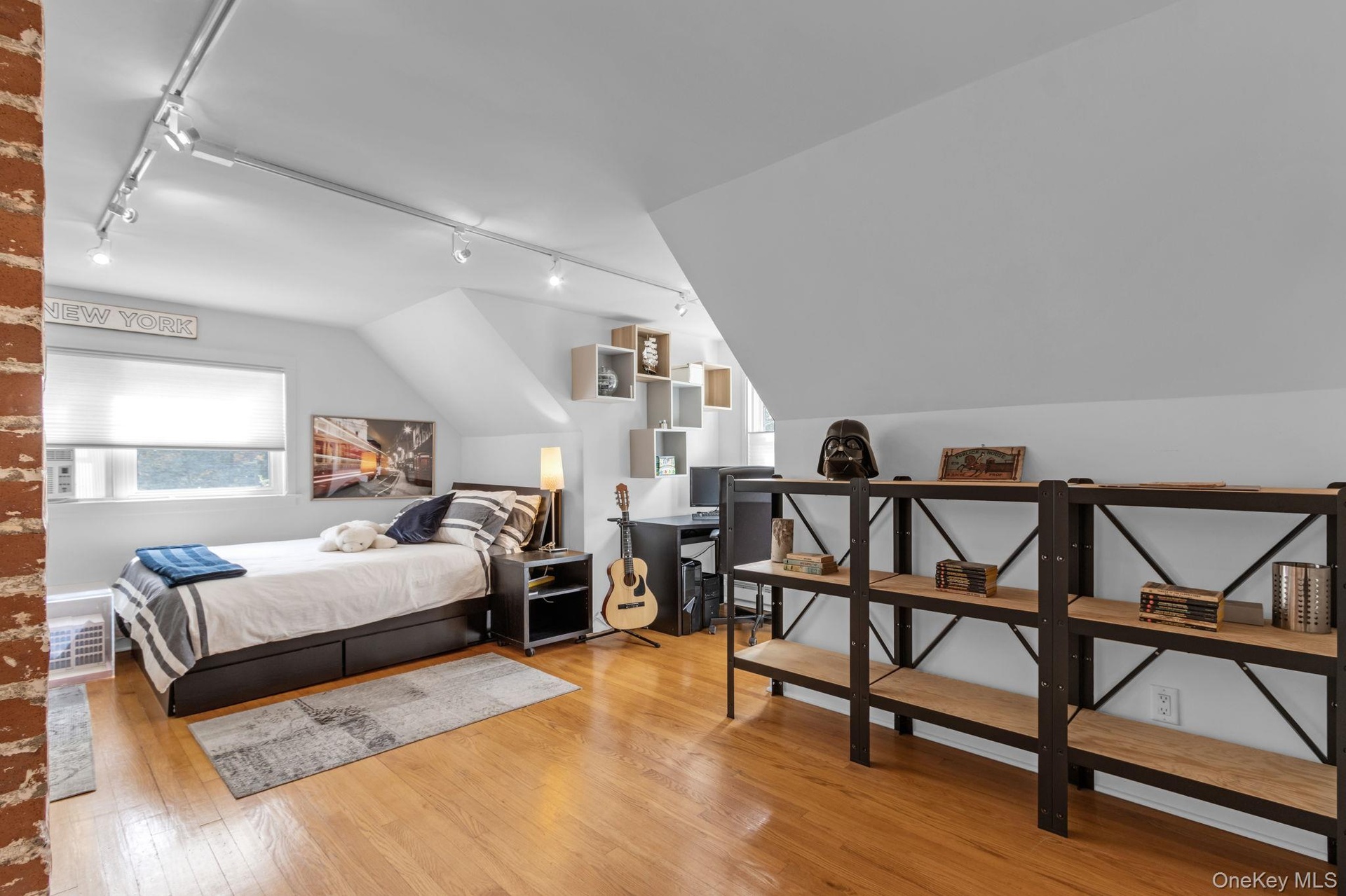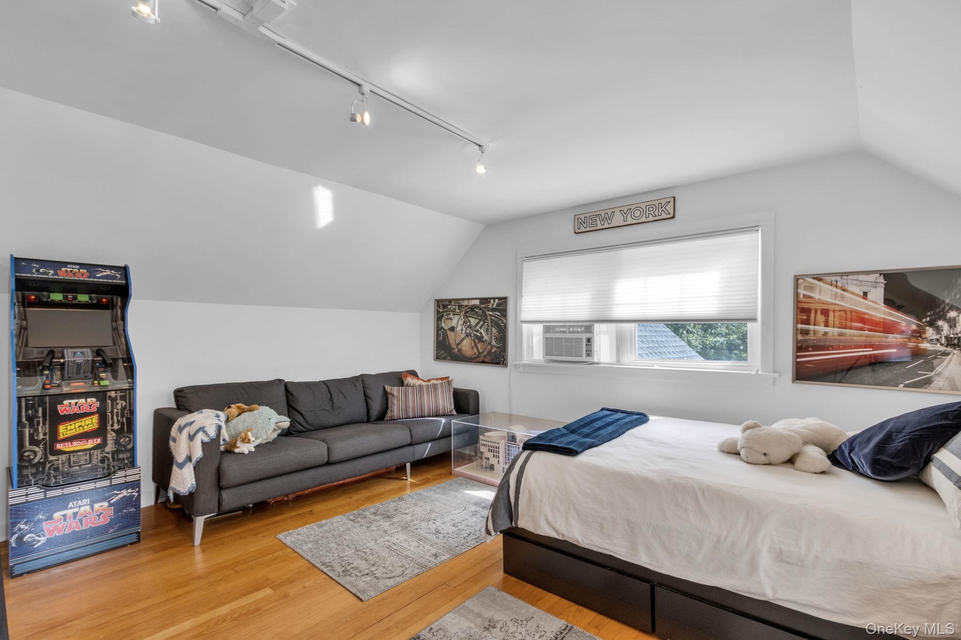 - Bedroom featuring lofted ceiling, track lighting, and wood finished floors