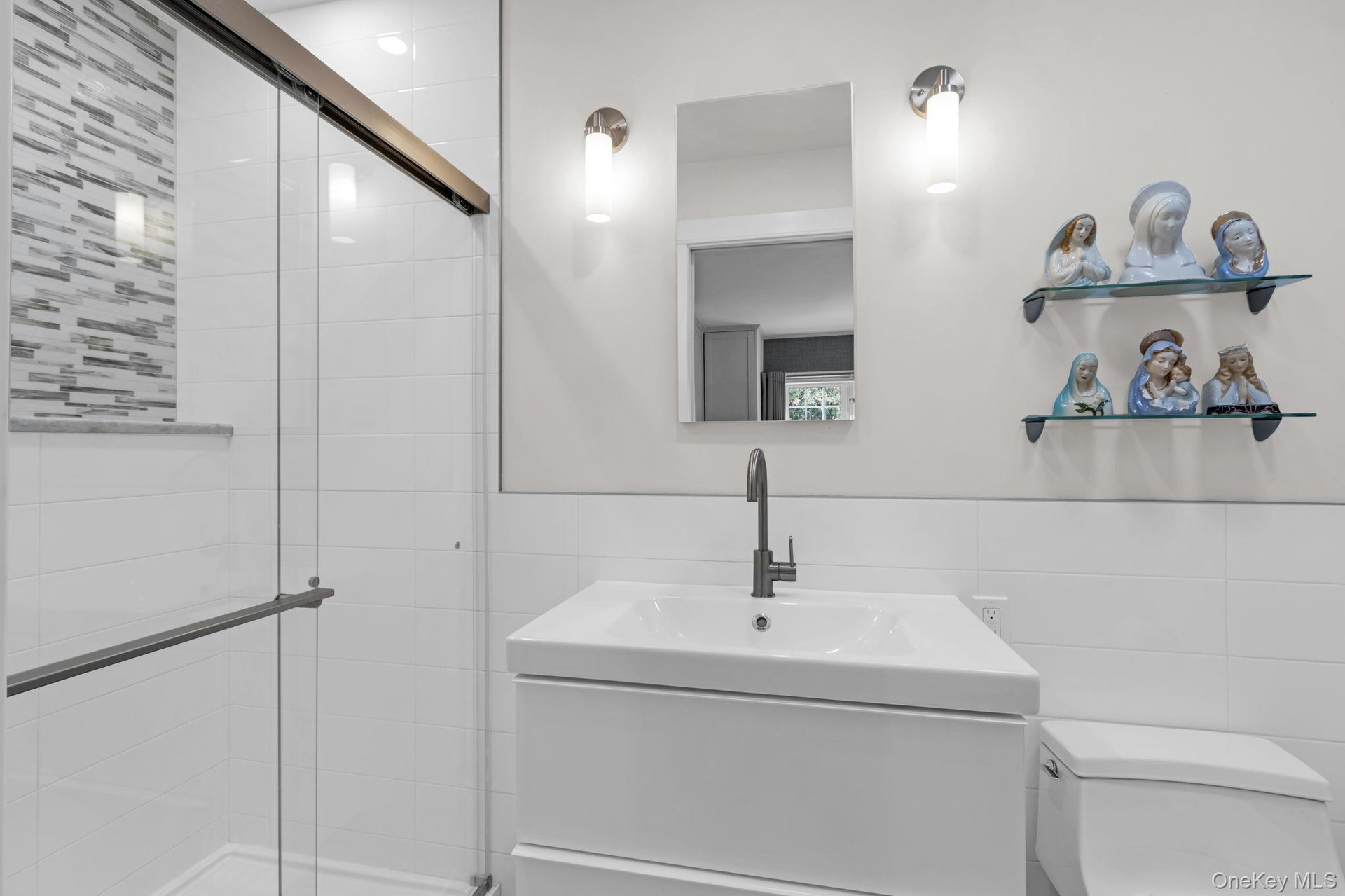 - Bathroom featuring vanity, a shower stall, tile walls, and a wainscoted wall