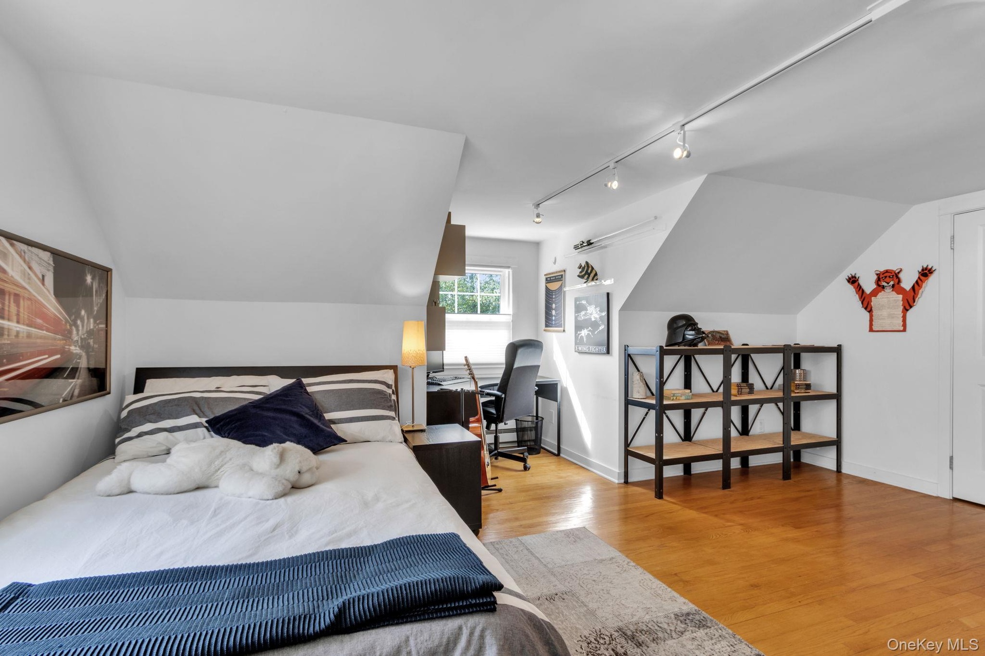- Bedroom featuring an office area, track lighting, light wood-type flooring, and lofted ceiling