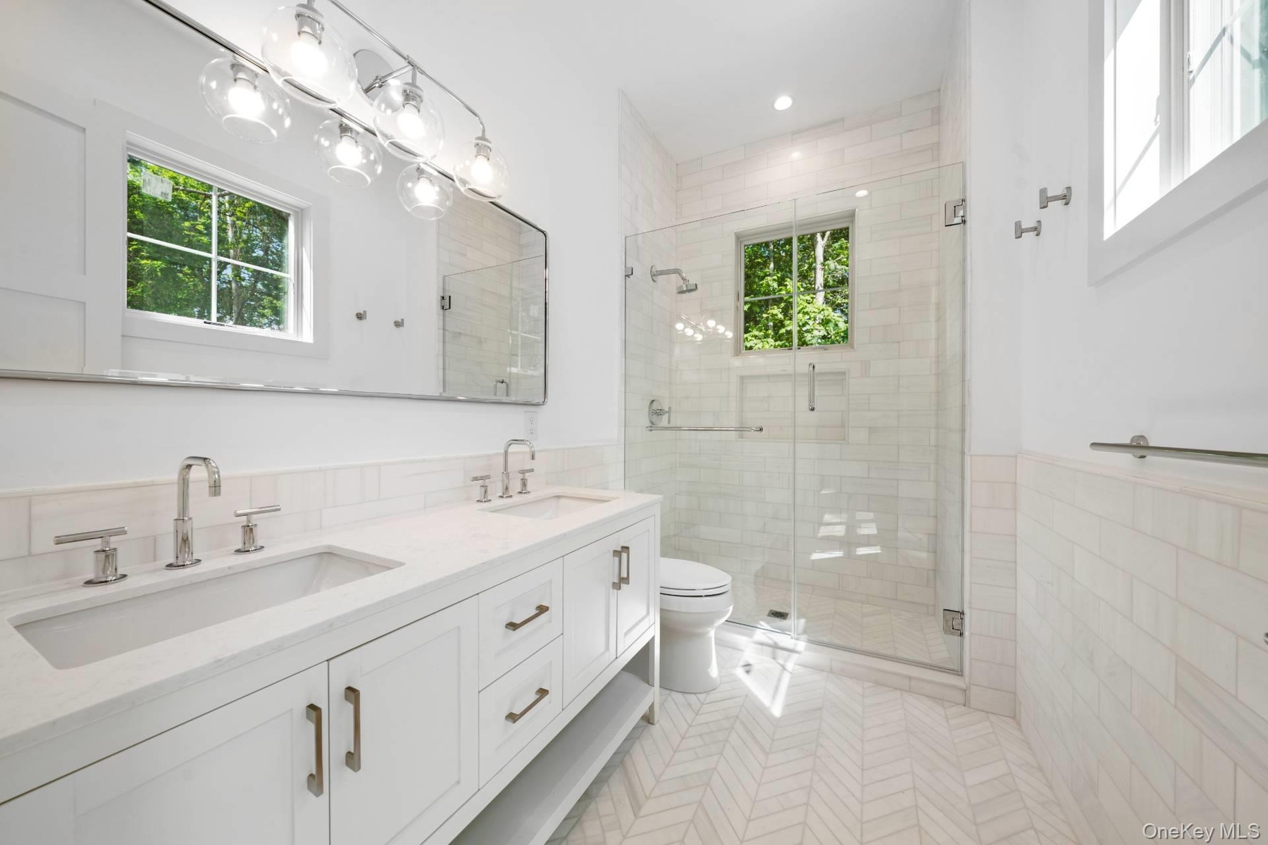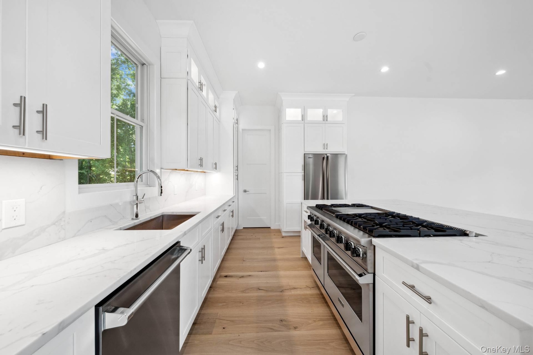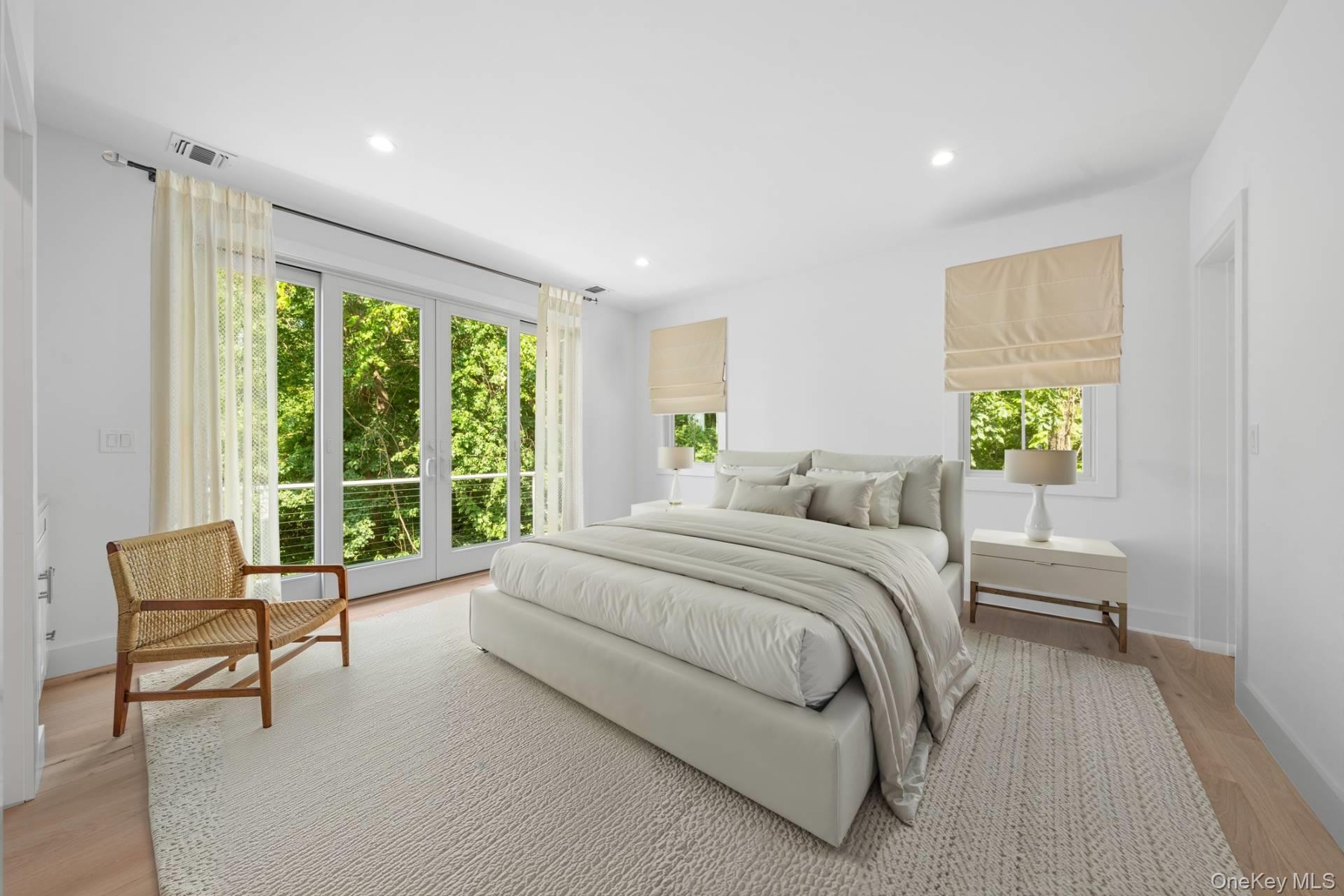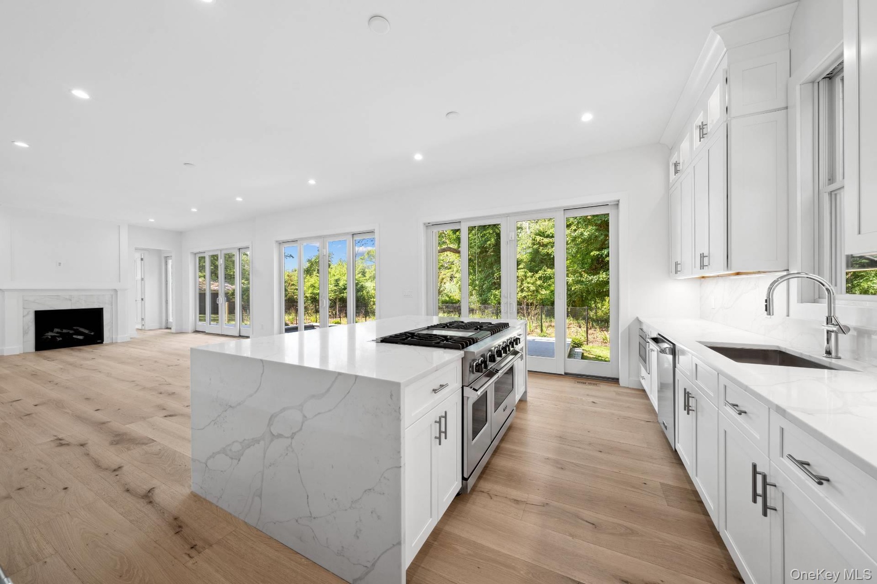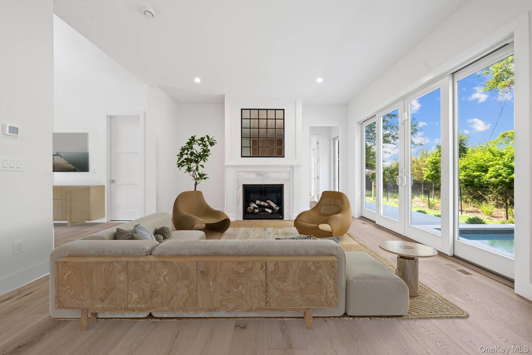 Experience the pinnacle of sophisticated coastal living in this exceptional, newly completed home, now available for the first time. Situated on a desirable private street with easy access to both Southampton Village and Sag Harbor Village, this residence is just 800-feet from a tranquil Peconic Bay beach and boasts glorious winter water views and stunning sunsets from the upper floor deck. This home masterfully blends indoor and outdoor spaces, which are perfect for entertaining, with glass sliding doors spanning the entire rear of the house, allowing you to seamlessly transition from the chic interior to the outdoor oasis. Upon entering, your gaze will be drawn through the open living space to the heated Gunite pool and back deck. The main level features a convenient junior primary en-suite bedroom and bath, alongside a spacious living/dining room featuring a cozy fireplace and sliders accessing the pool area. The kitchen is a dream, outfitted with quartz countertops, an expansive island with waterfall edges, a generous large (walk in) pantry, and high-end Viking appliances. The second story boasts four additional en-suite bedrooms, including a private primary bedroom and bath appointed with high end Carrera marble tile and a balcony providing serene views of the lush backyard. As a bonus, the top floor provides a second option for indoor/outdoor living . This is more than a home; it's a lifestyle waiting to be enjoyed.