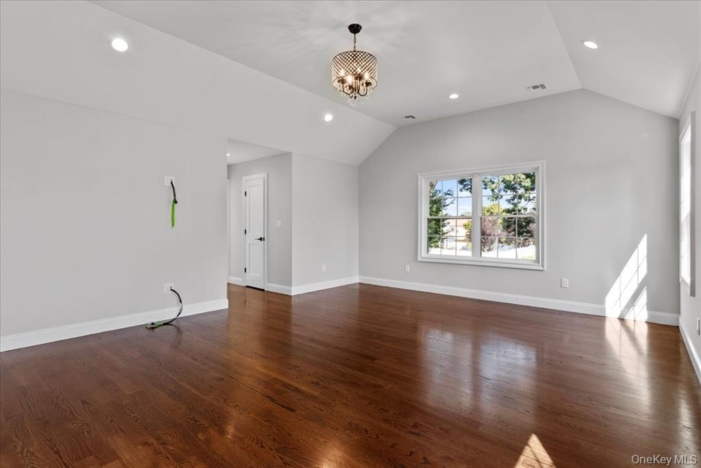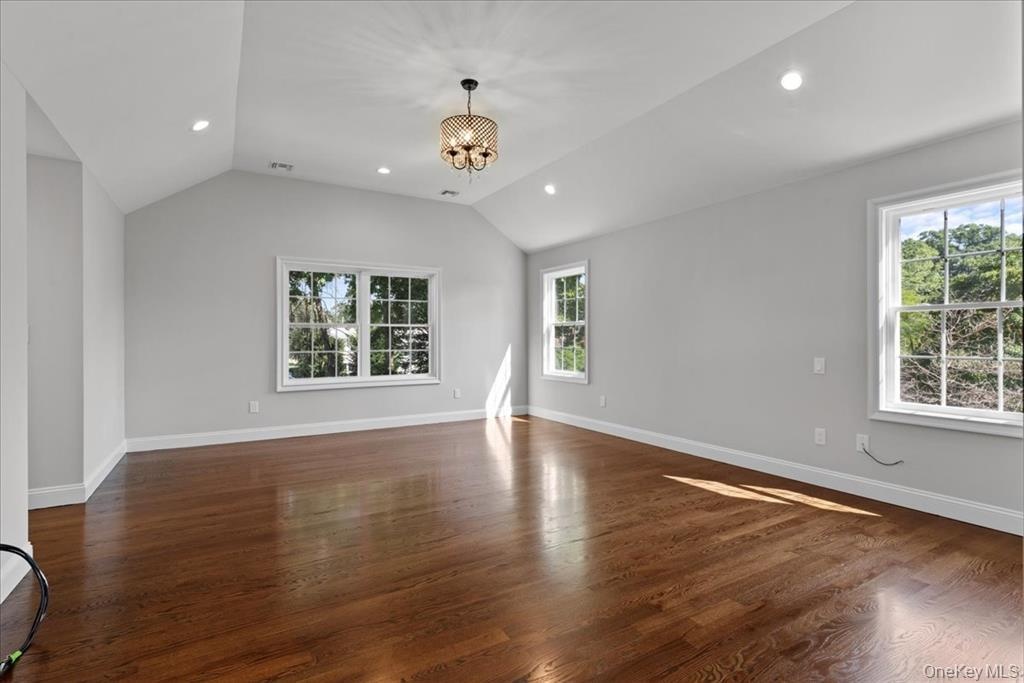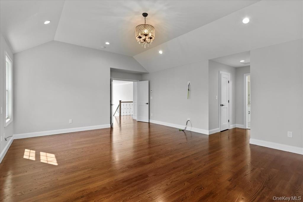 - Master Bedroom with healthy amount of natural light, a chandelier, dark wood-style flooring, recessed lighting, and lofted ceiling