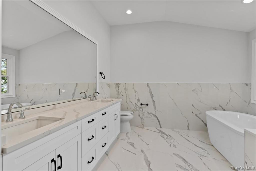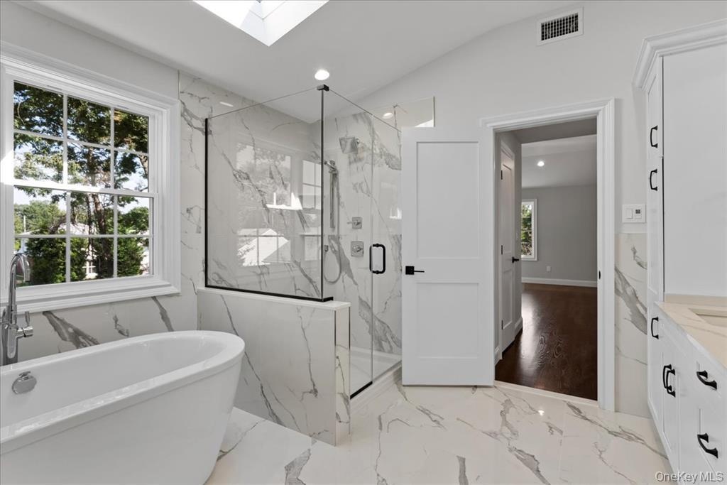 - Master Full Bathroom with a soaking tub, sky light, recessed lighting, double vanity, large mirror, frameless-glass shower, and flawlessly tiled floo