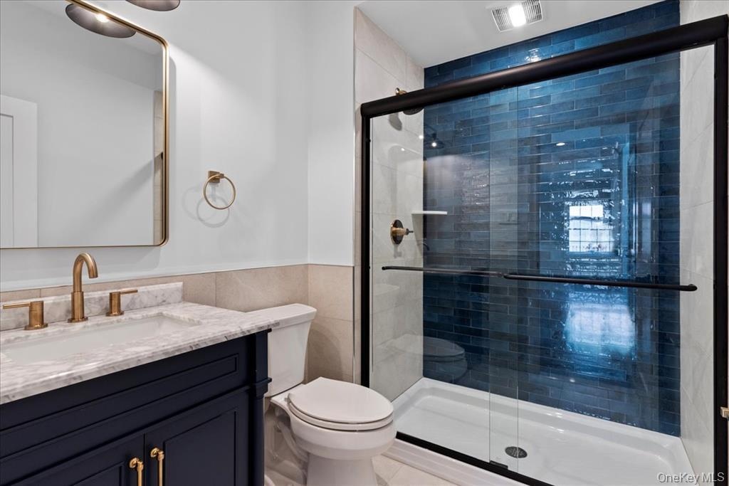 - 1st floor Full bathroom featuring vanity, stall shower with sliding glass doors, & flawlessly tiled.