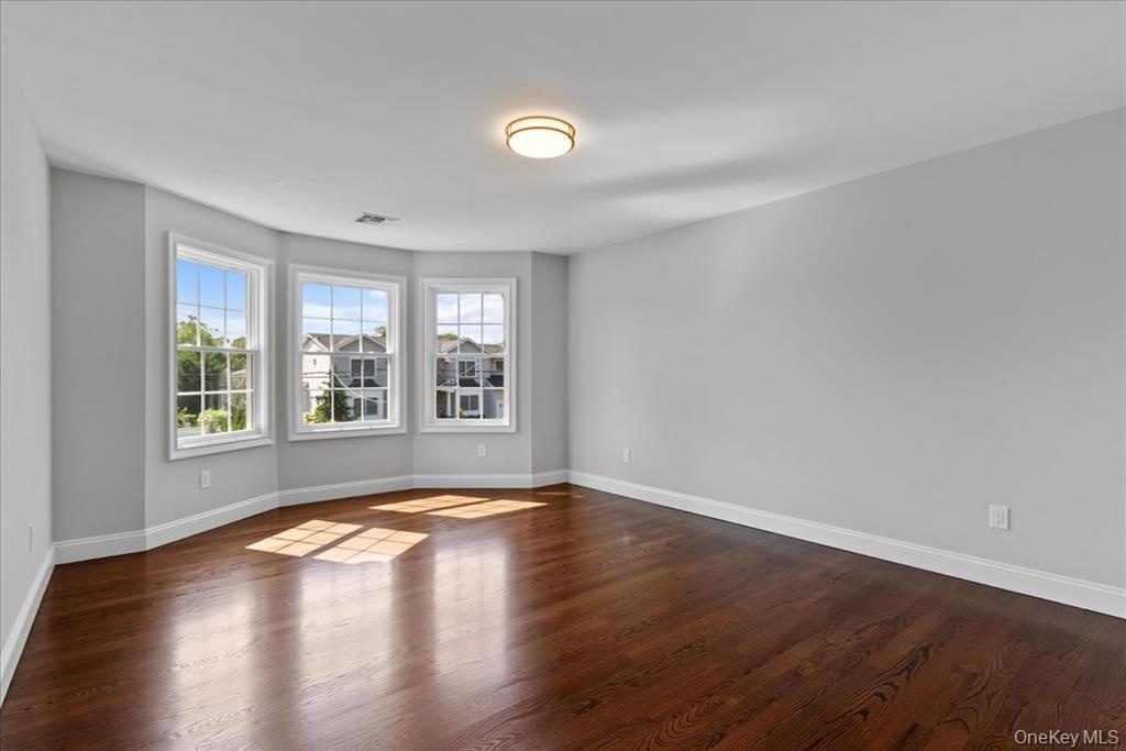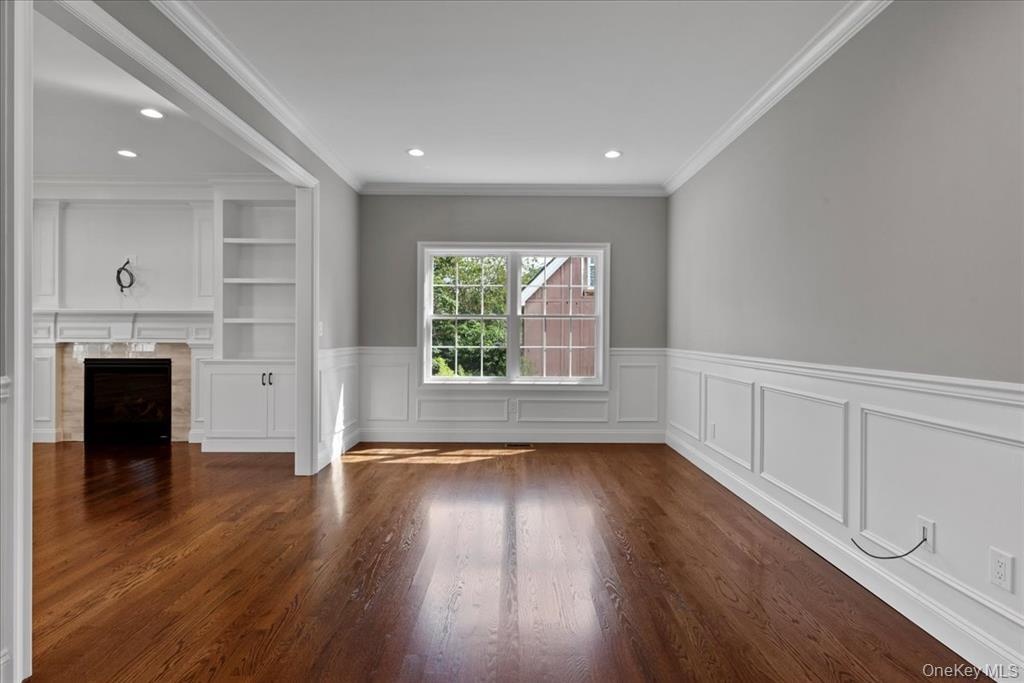 - Spare room (bdrm#5 or office/guest rm) next to family room with recessed lighting, dark wood finished floors, ornamental molding, a wainscoted wall, a