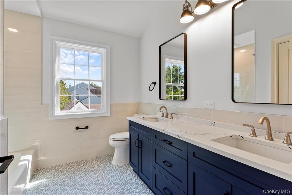 - 2nd floor Hall Bathroom with double vanity, tile walls, and bathtub