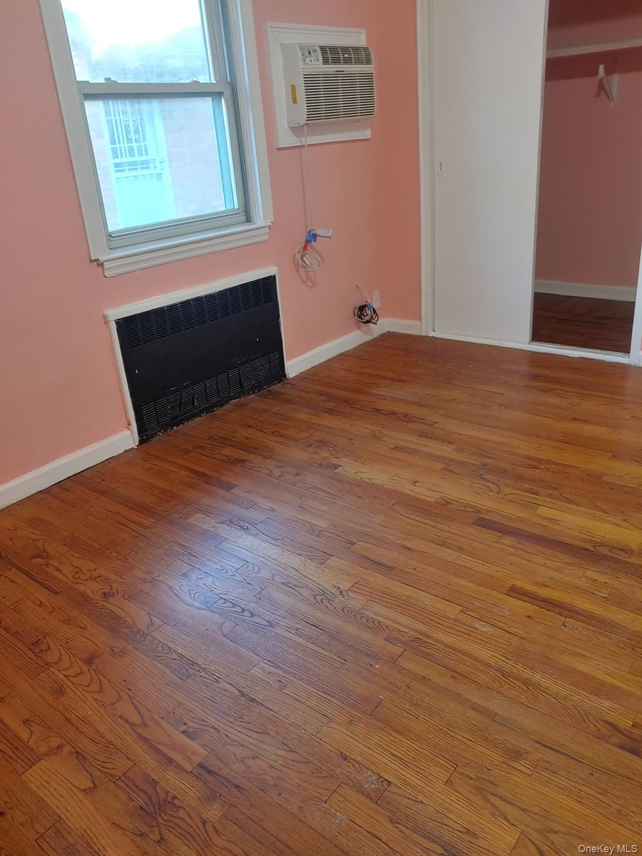 - Unfurnished living room featuring hardwood / wood-style floors, radiator, and an AC wall unit