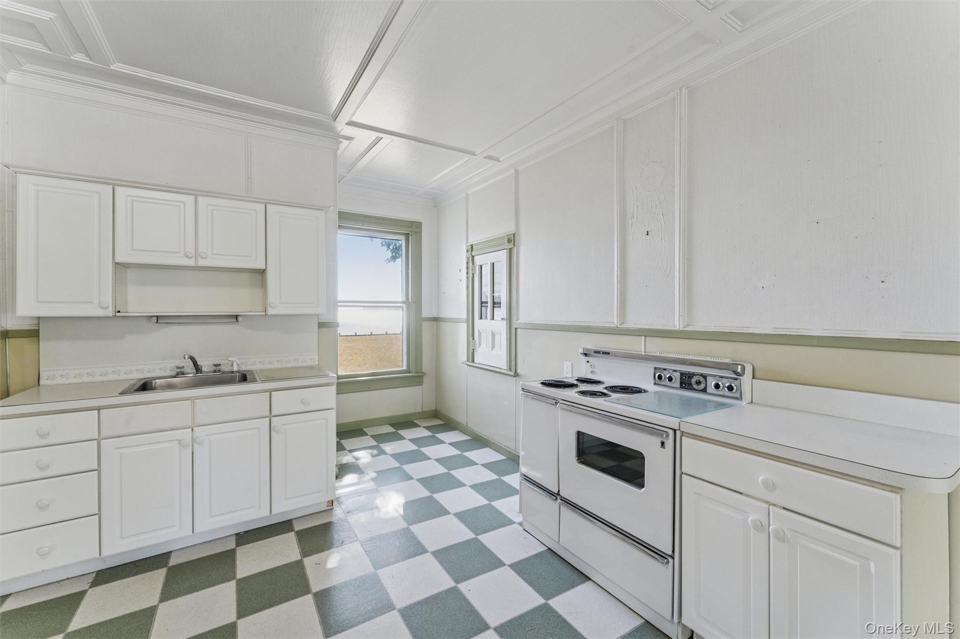 - Kitchen with light floors, range with two ovens, white cabinetry, and light countertops