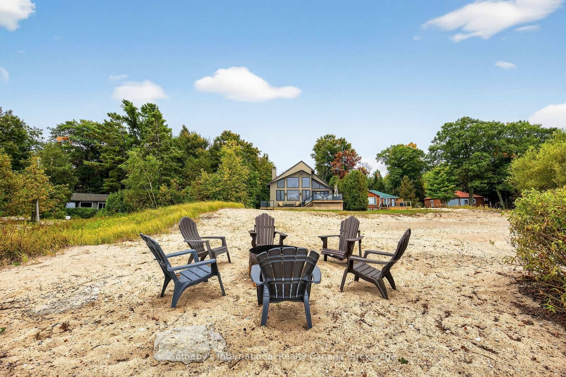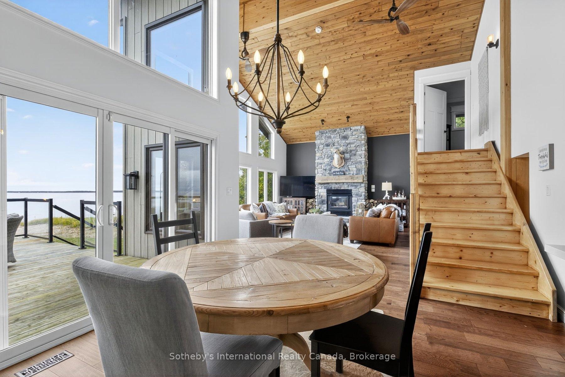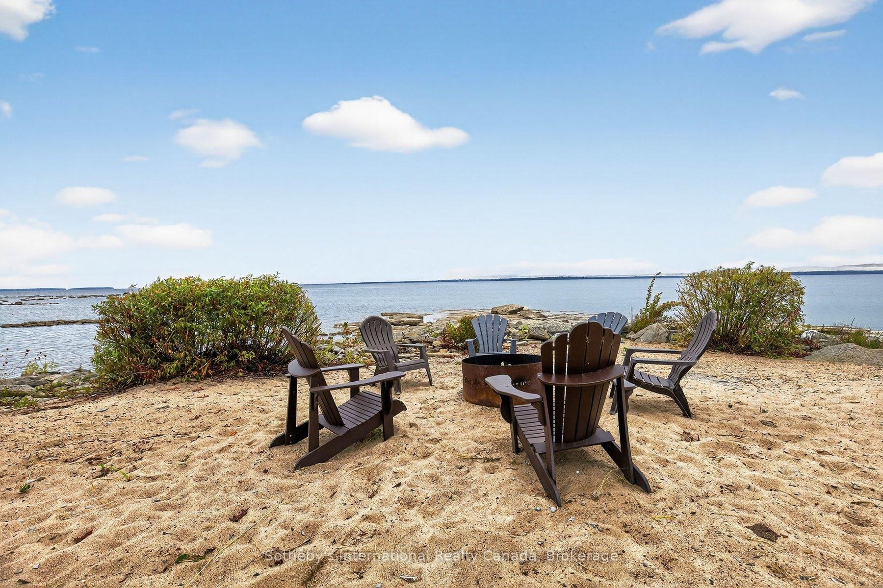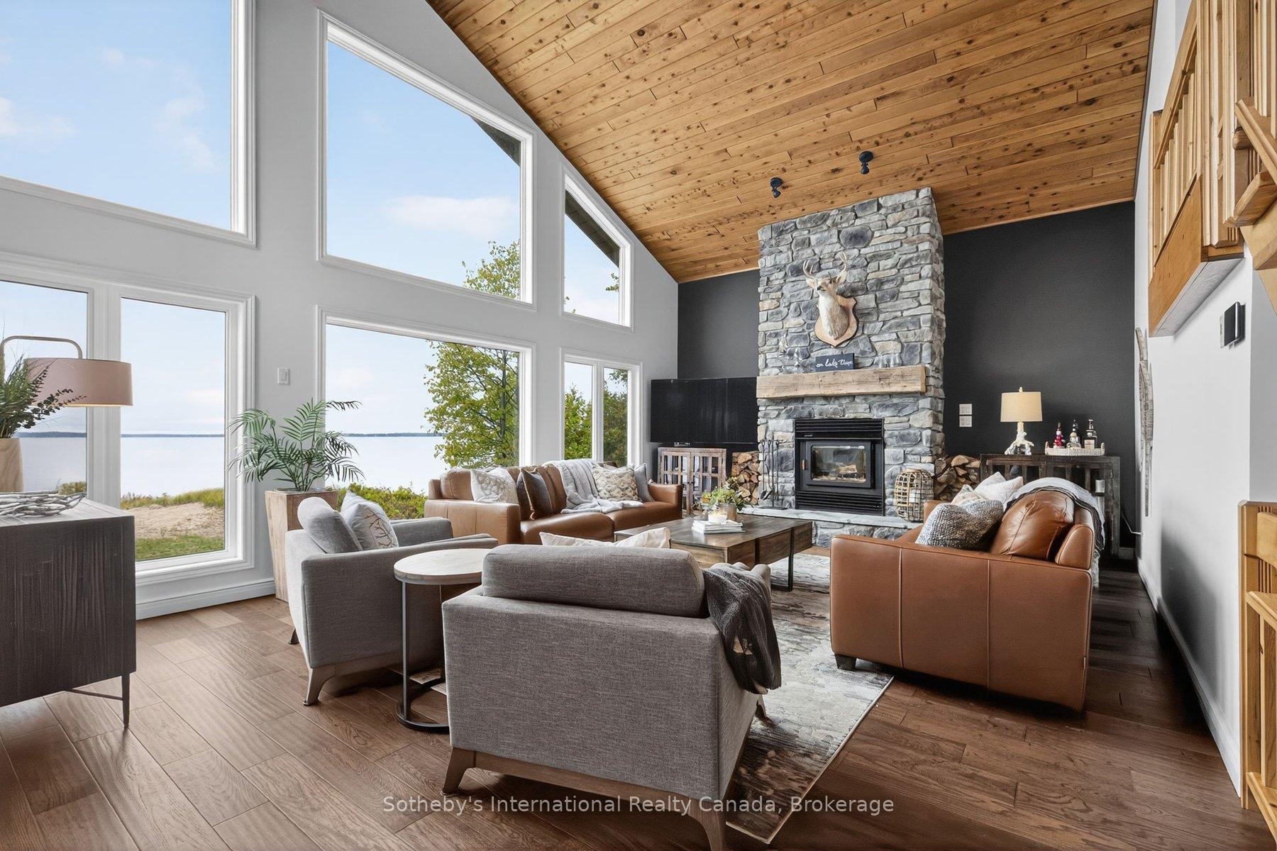 From the first light of dawn painting the bay in soft pinks to fiery sunsets stretching across the horizon, 1773 Champlain Rd offers a front-row seat to the exquisite beauty of Georgian Bay. With a stretch of natural shoreline, it delivers a true beach house lifestyle, the kind of property where the water shimmers at your doorstep, inviting barefoot days & memorable nights. This 3-bed, 2-bath beach house strikes a harmony between warmth & sophistication. A stone path leads to the front door, where the open-concept main floor unfolds with soaring cedar ceilings & engineered hardwood underfoot. Custom millwork by Interior Works Inc. defines the home, with a bespoke kitchen & beautifully finished bathrooms. Anchored by a generous quartz island & farmhouse sink. It flows into the dining area, perfect for dinners that linger long into the evening. Sliding doors open to the deck, where alfresco meals are enjoyed with panoramic lake views. Floor-to-ceiling windows draw the Bay into the heart of the home, while a Napoleon wood-burning fireplace adds warmth & intimacy. Upstairs, the primary suite is a private sanctuary. A freestanding clawfoot tub creates a sense of enduring romance. A custom walk-in closet blends function with elegance. At the same time, the spa-inspired ensuite is elevated with a generous double vanity, heated floors, a heated towel rack, & a glass curbless walk-in shower. Two additional beds & a stylish 3-pc bath create a welcoming retreat for family & guests. A main-floor laundry adds convenience, while the oversized detached garage (1344 sq ft) provides ample storage & endless potential in the loft above. The unfinished basement offers space for future customization. Completely updated inside and out. Windows & doors(2017), Tankless HTW(2024), Metal Roof(2019), Kitchen(2018), Baths(2025), Engineered hardwood floors(2025), Generac Generator(2025), Irrigation System(2019), Water Softener(2023), A/C & Furnance(2023).