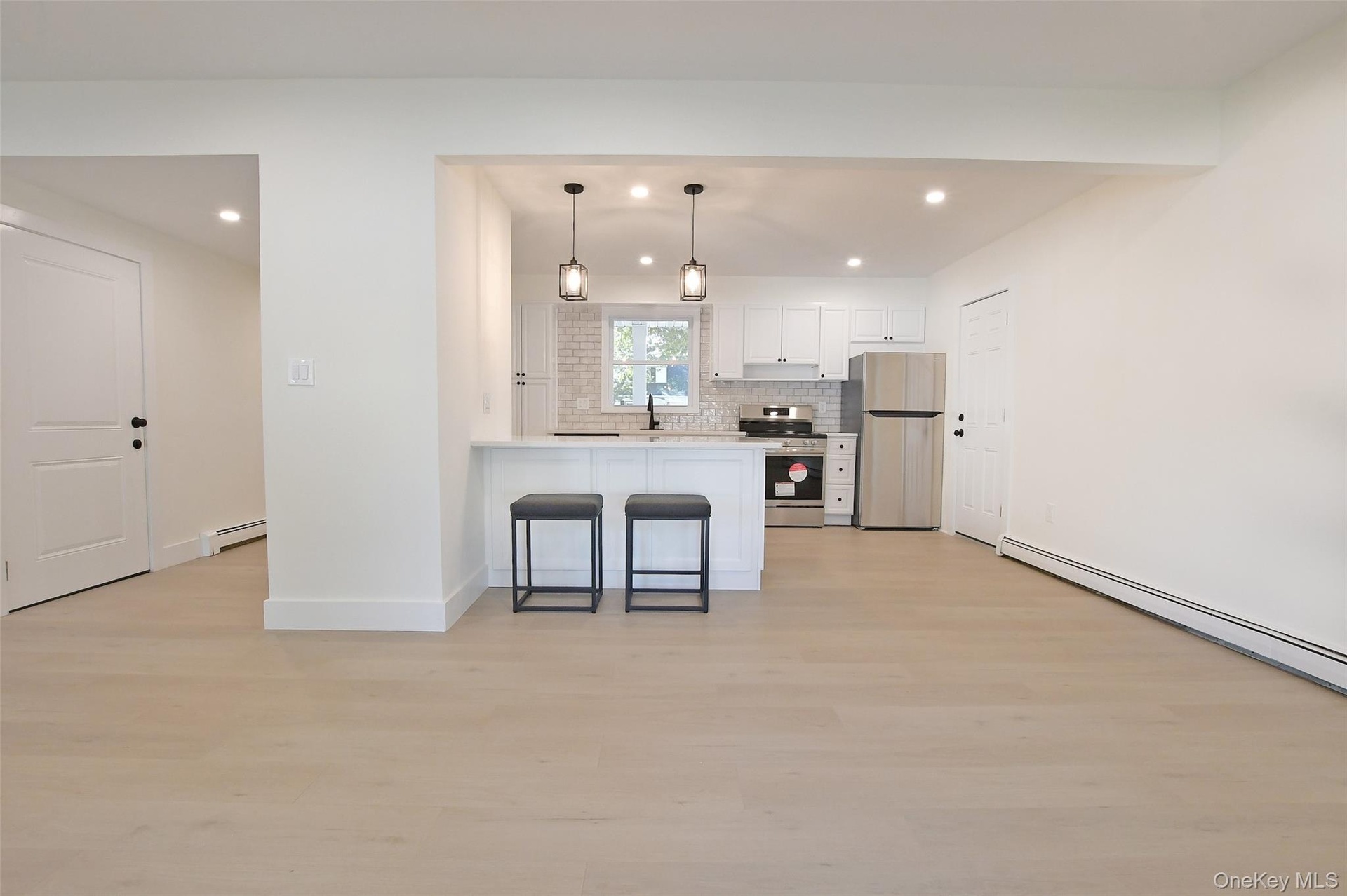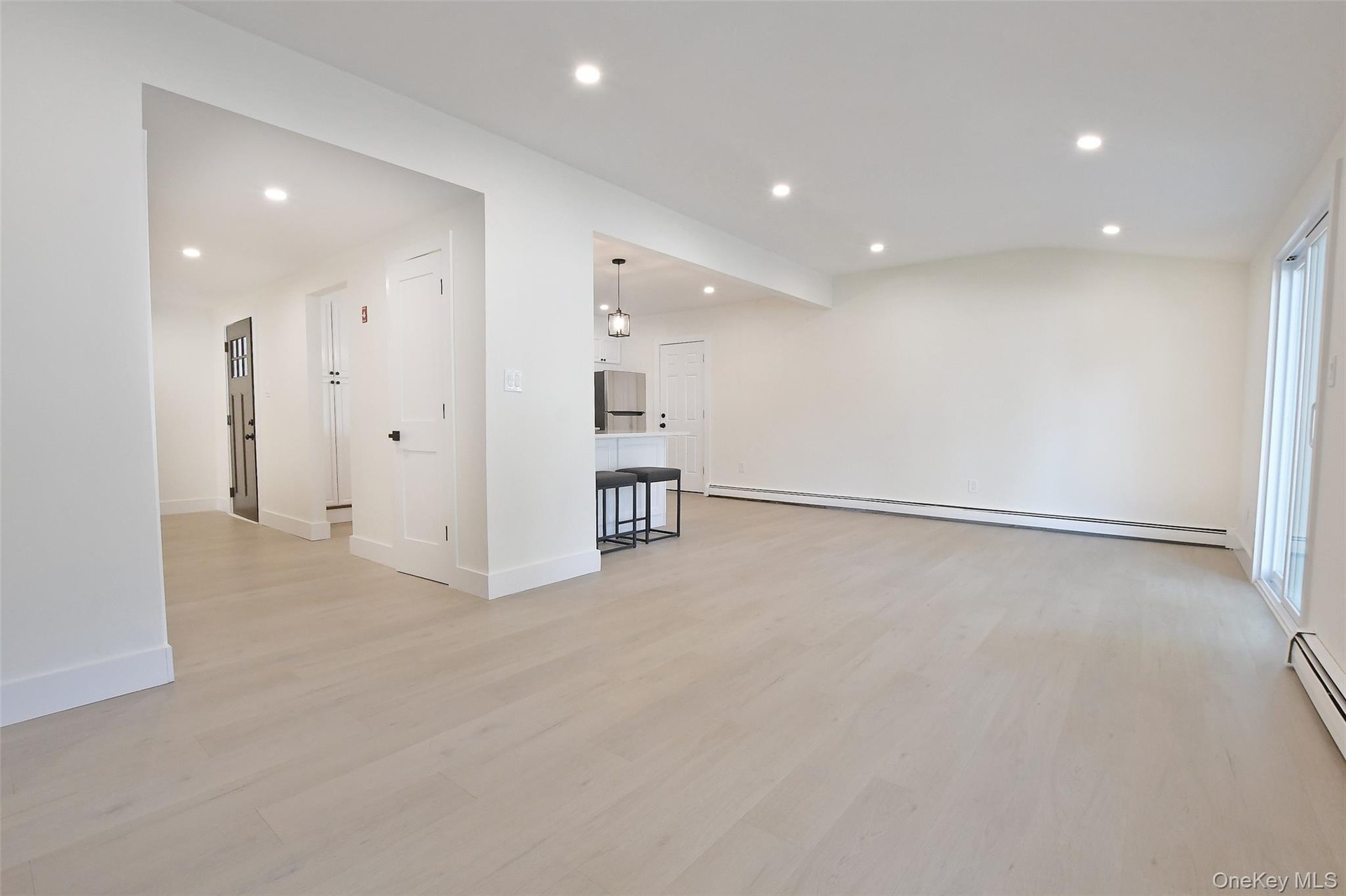 - Unfurnished living room with recessed lighting, light wood-style flooring, and baseboard heating