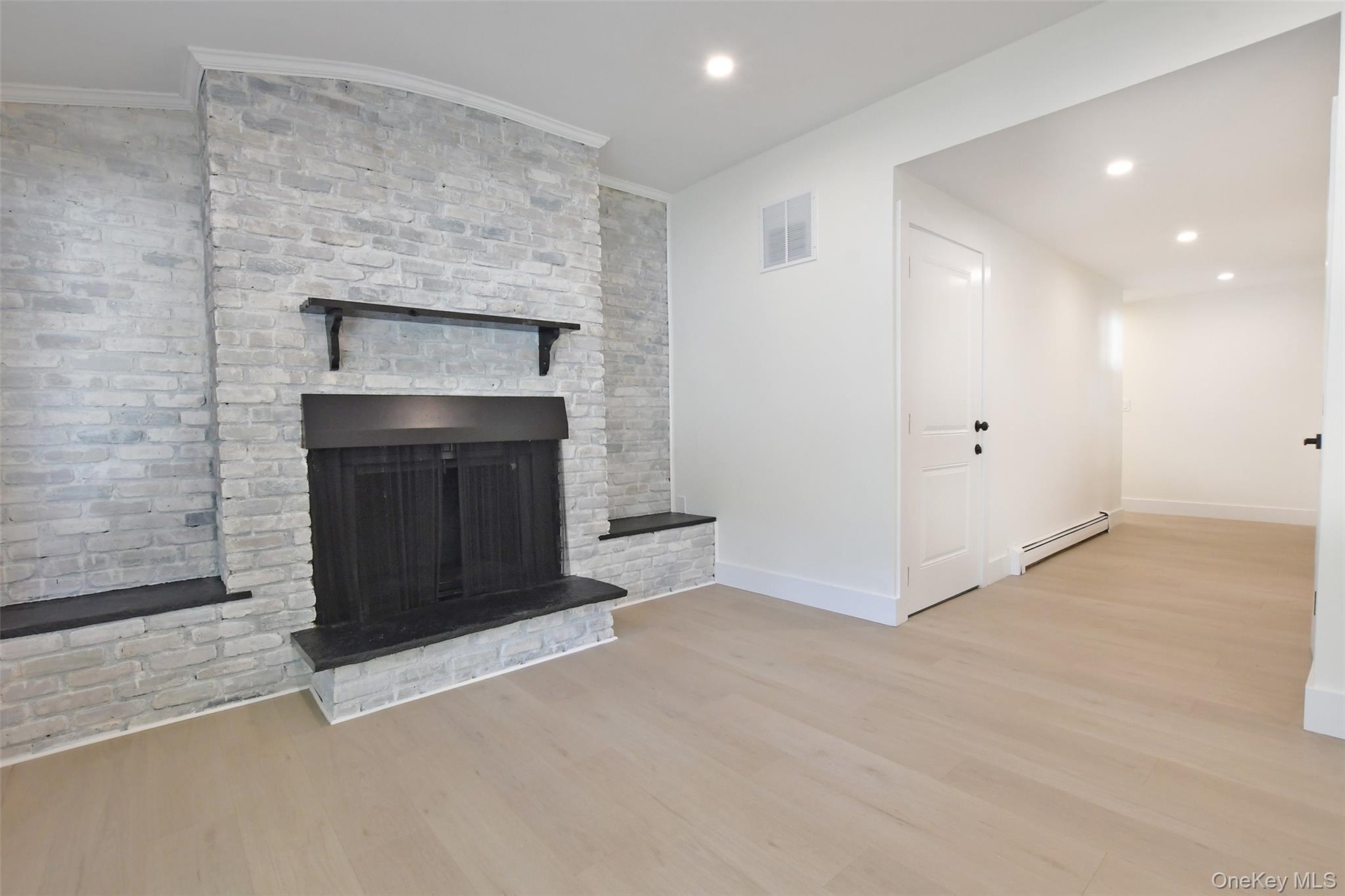 - Unfurnished living room featuring recessed lighting, a brick fireplace, light wood-style floors, and baseboard heating