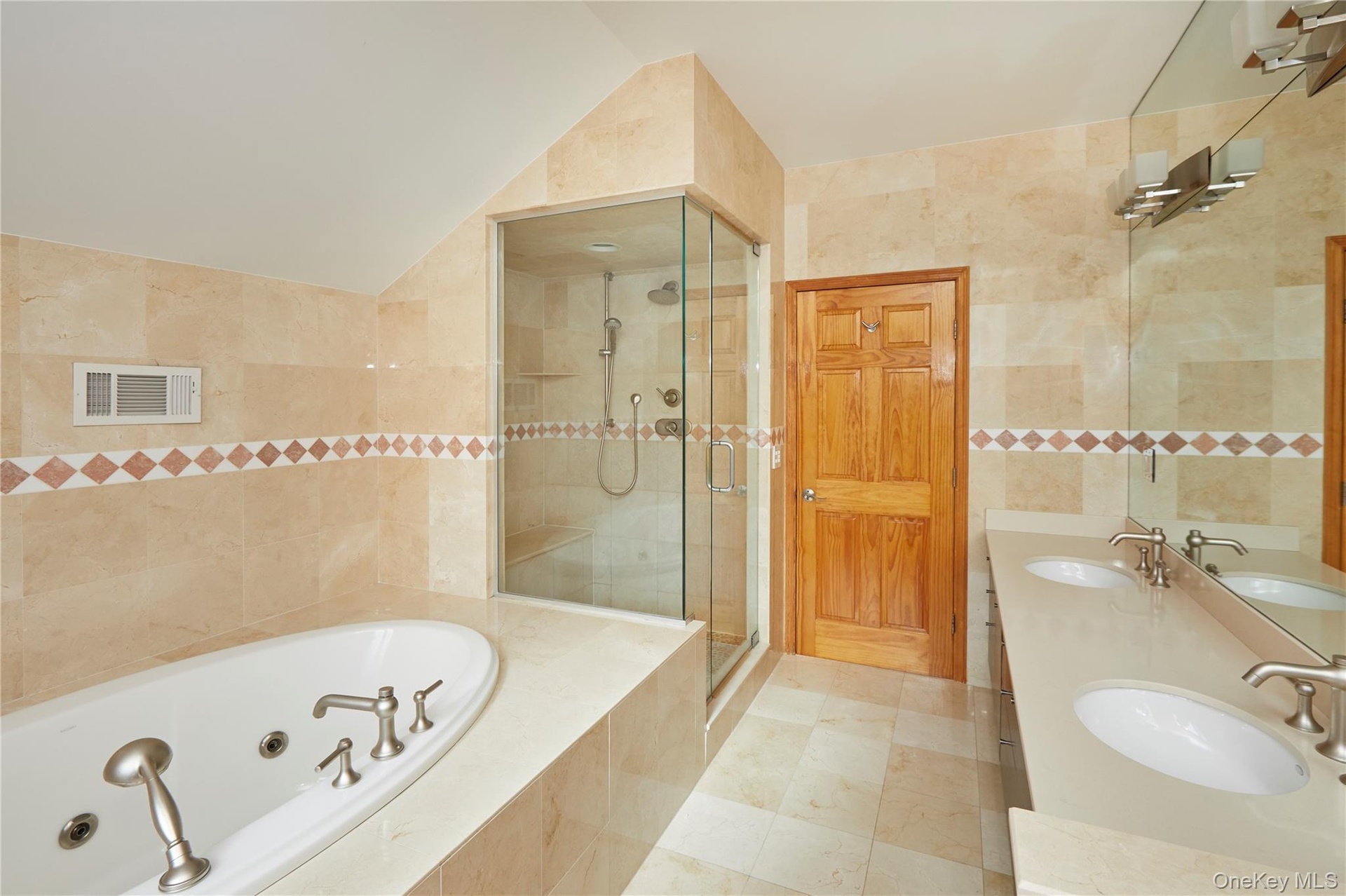 - Bathroom with tile walls, a stall shower, a whirlpool tub, double vanity, and tile patterned flooring