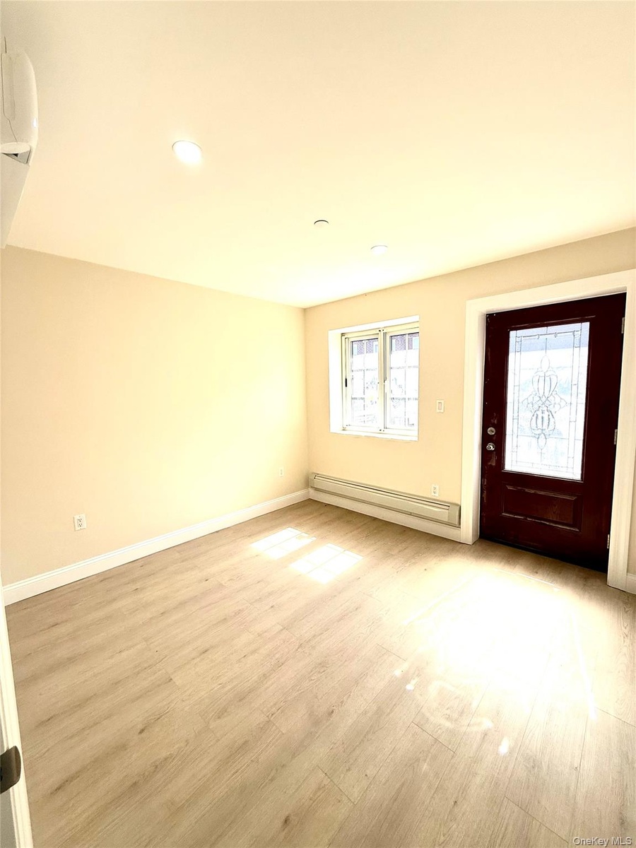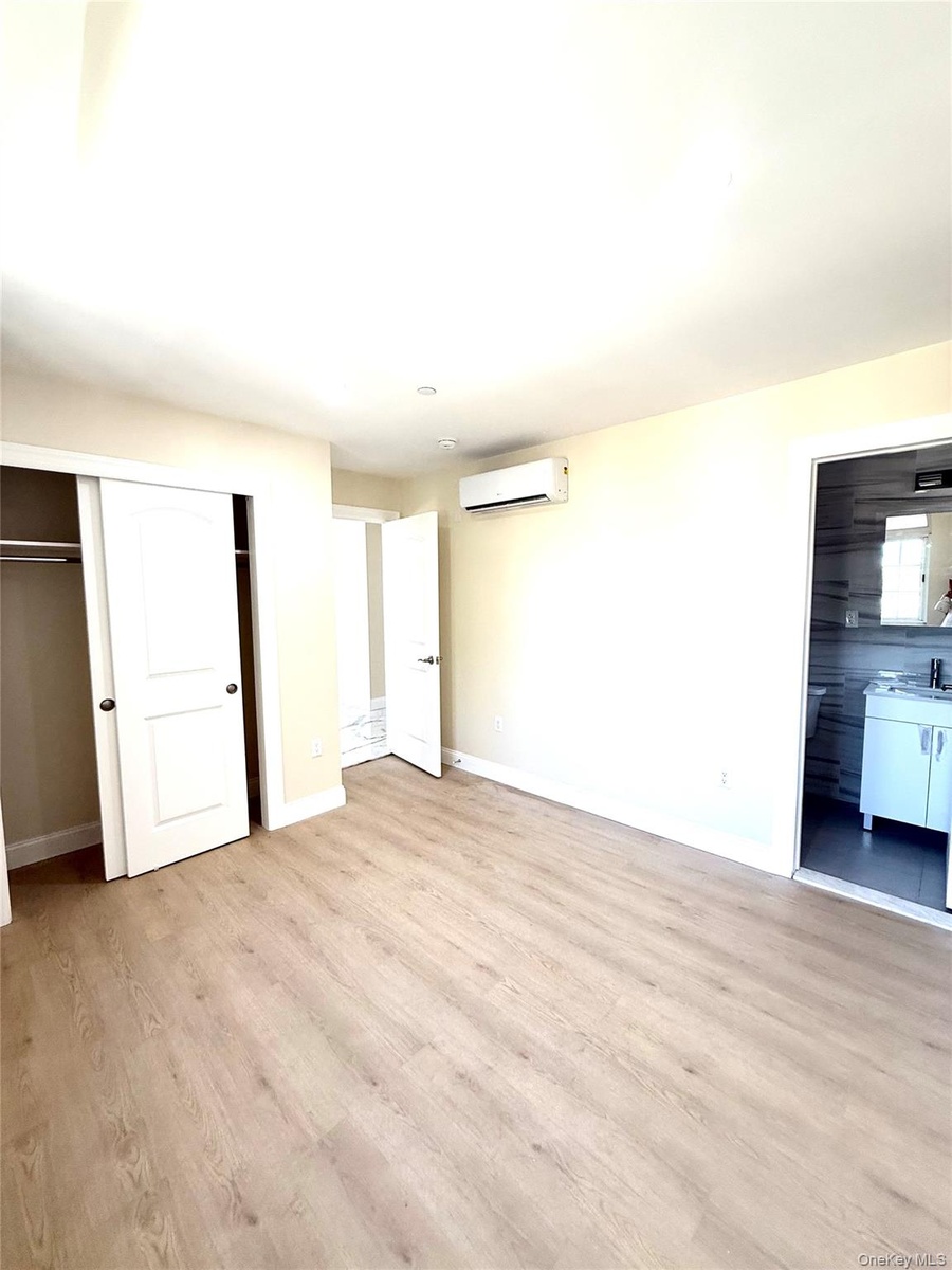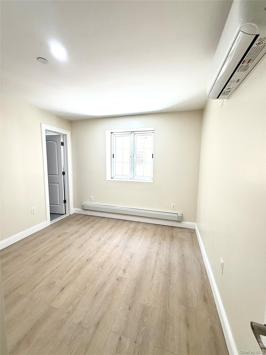 - Empty room with a wall mounted AC, light wood-type flooring, and baseboard heating