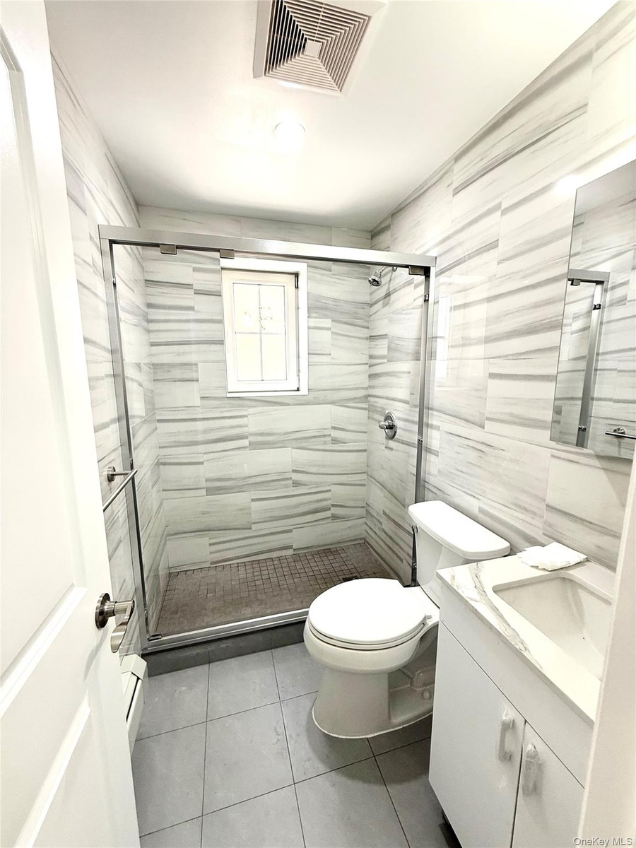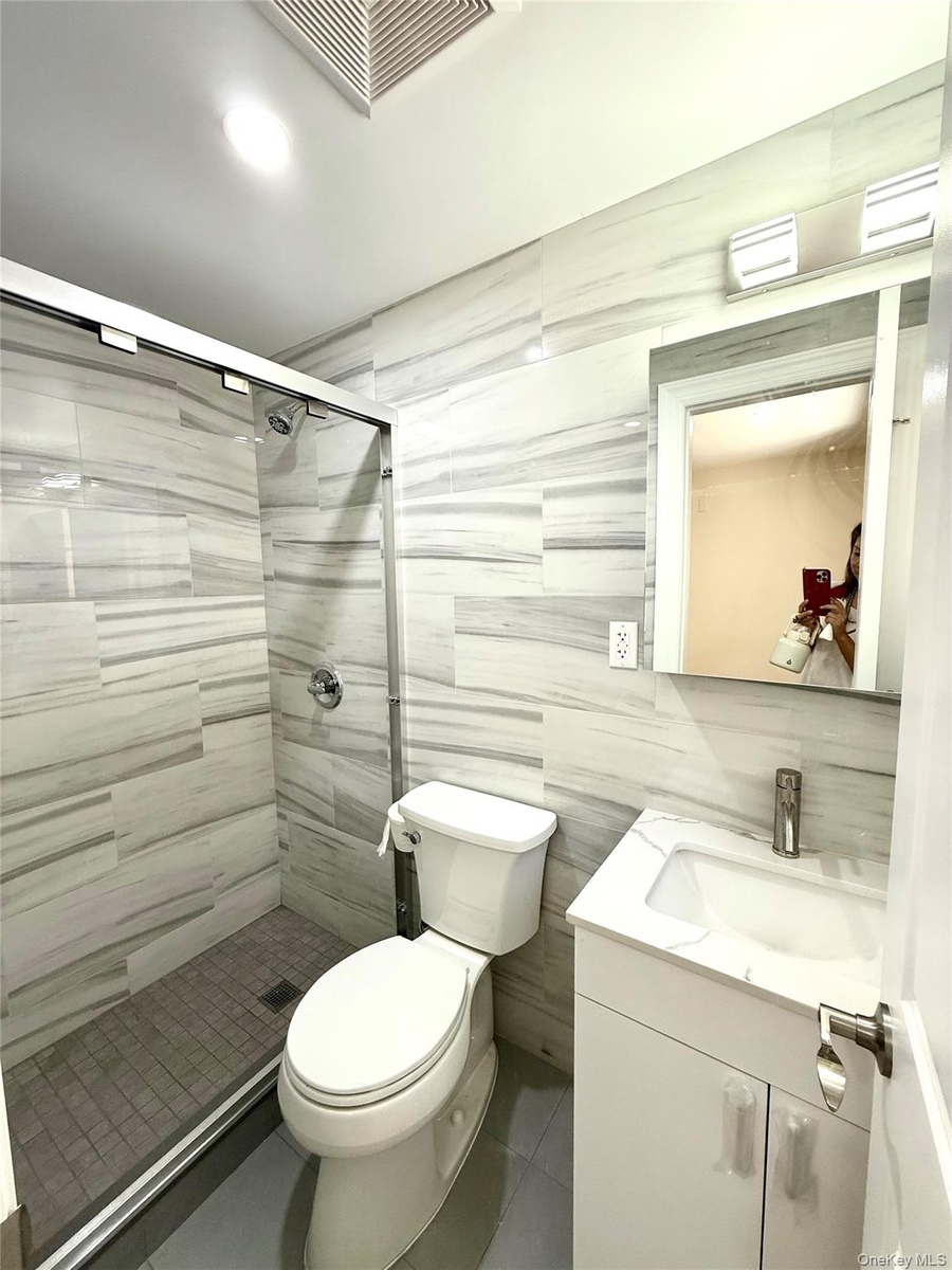 - Full bathroom with vanity, a stall shower, tile walls, and light tile patterned flooring