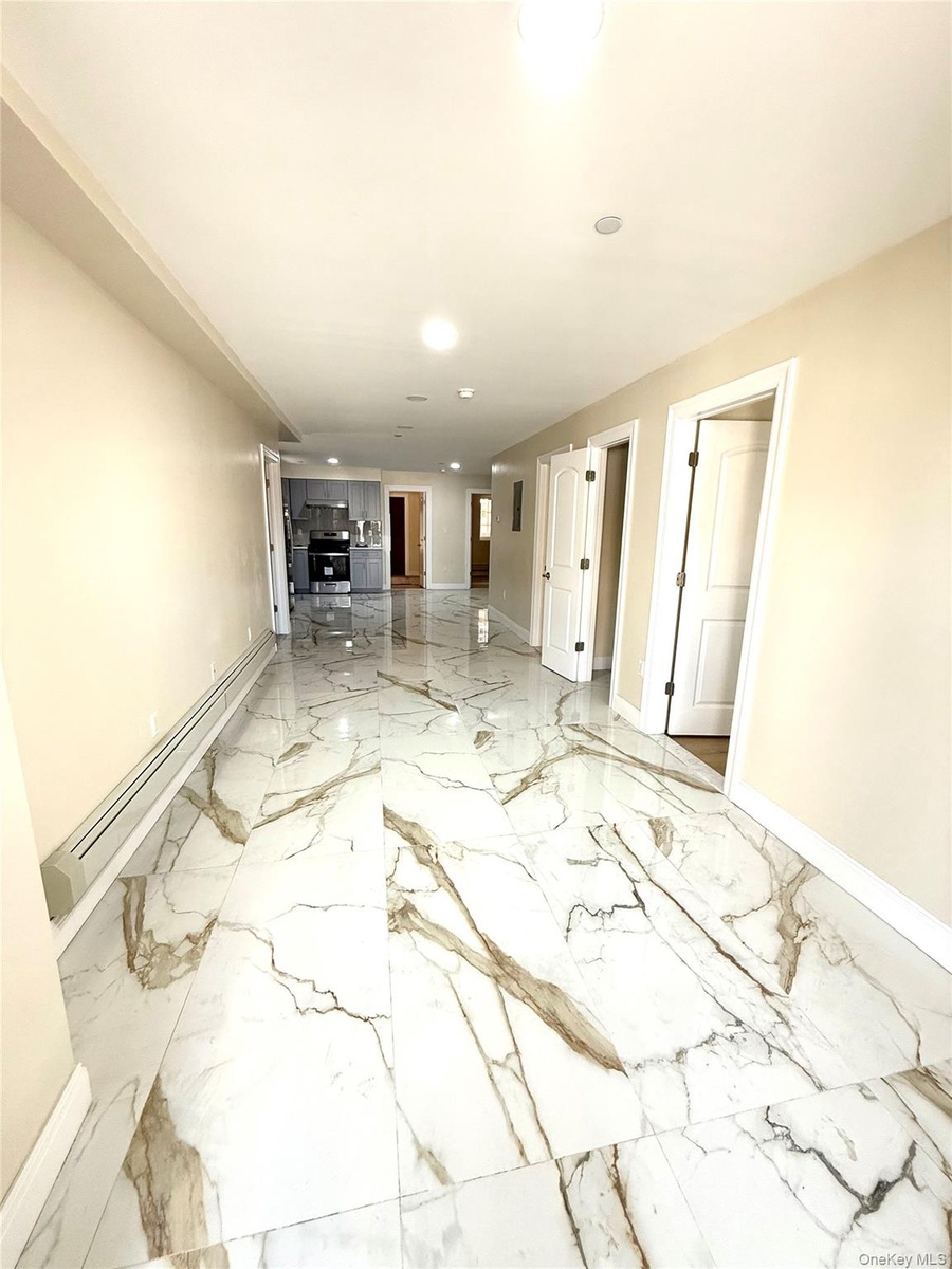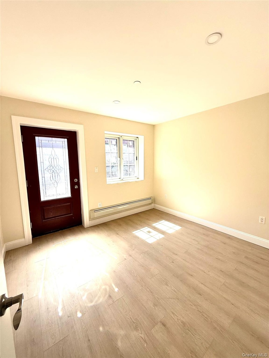 - Entrance foyer featuring wood finished floors, baseboard heating, and recessed lighting
