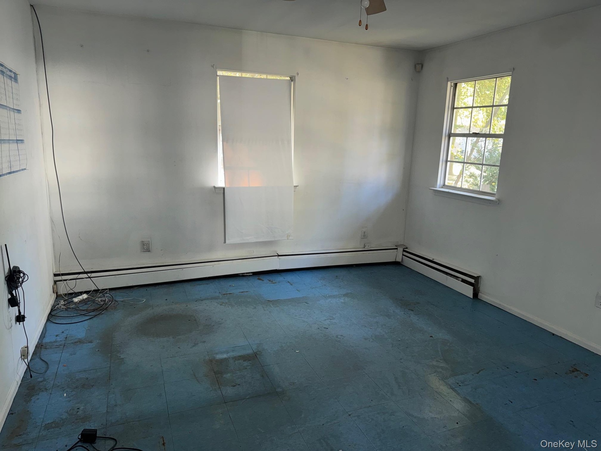 - Empty room featuring a baseboard heating unit and ceiling fan