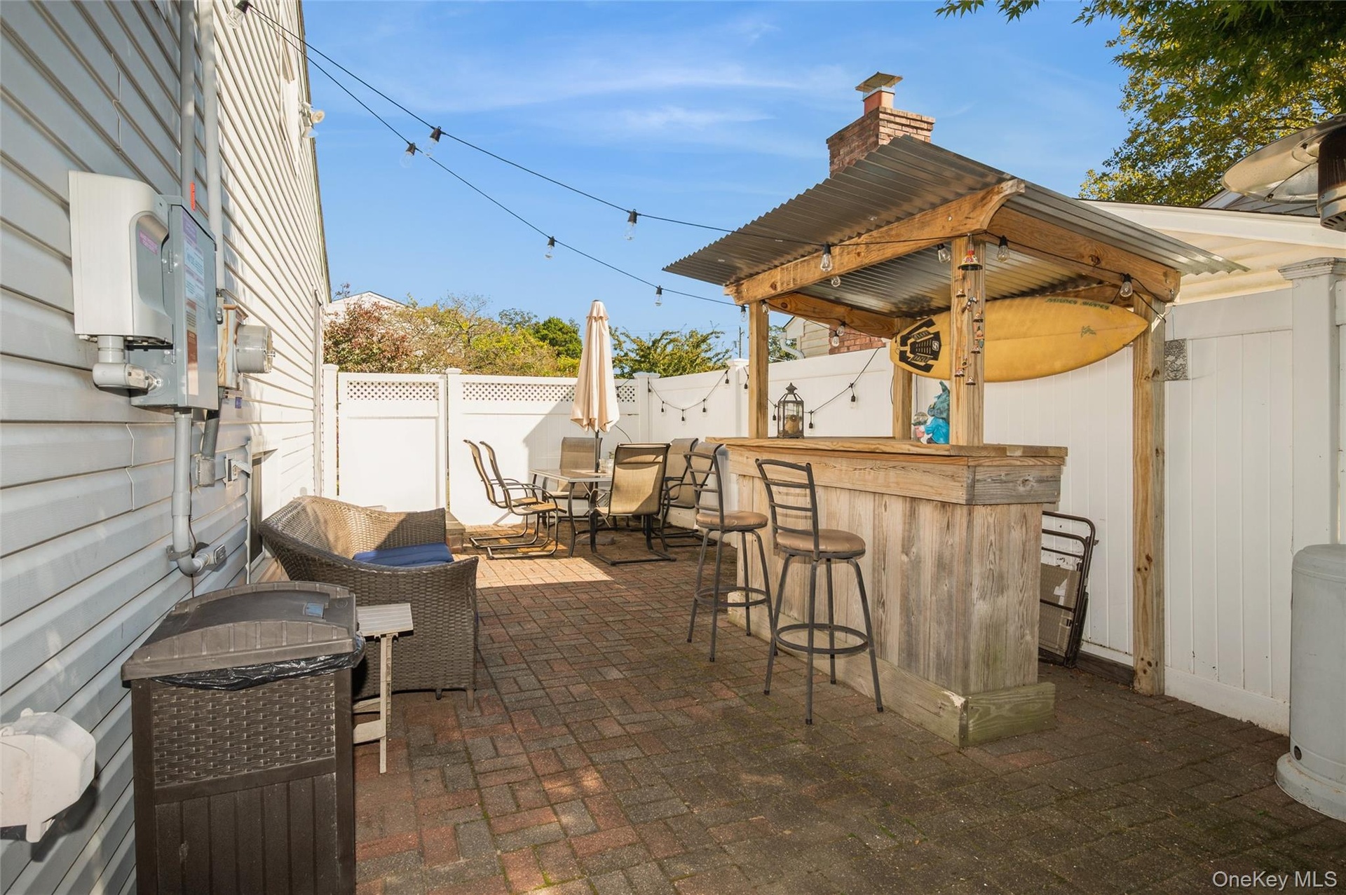 - Fenced backyard with a patio and outdoor dining space