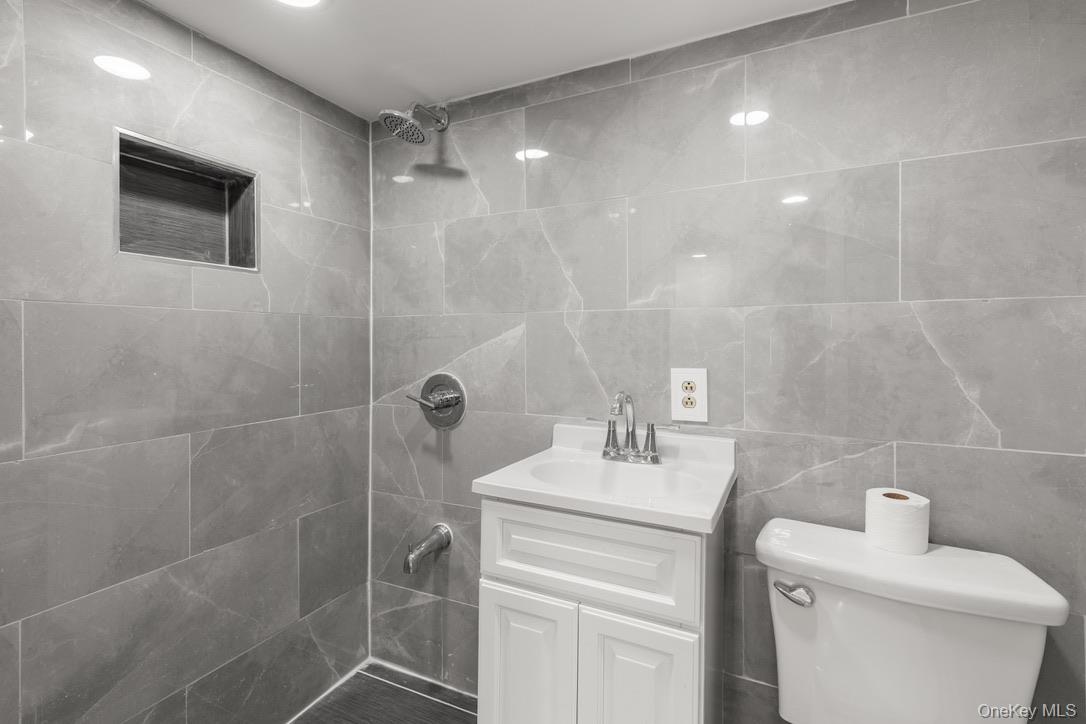 - Bathroom featuring tiled shower, vanity, and tile walls