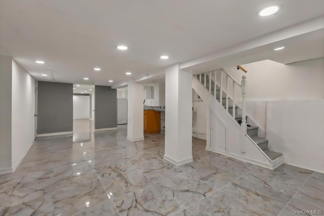 - Finished basement with recessed lighting, light marble finish flooring, stairs, and freestanding refrigerator