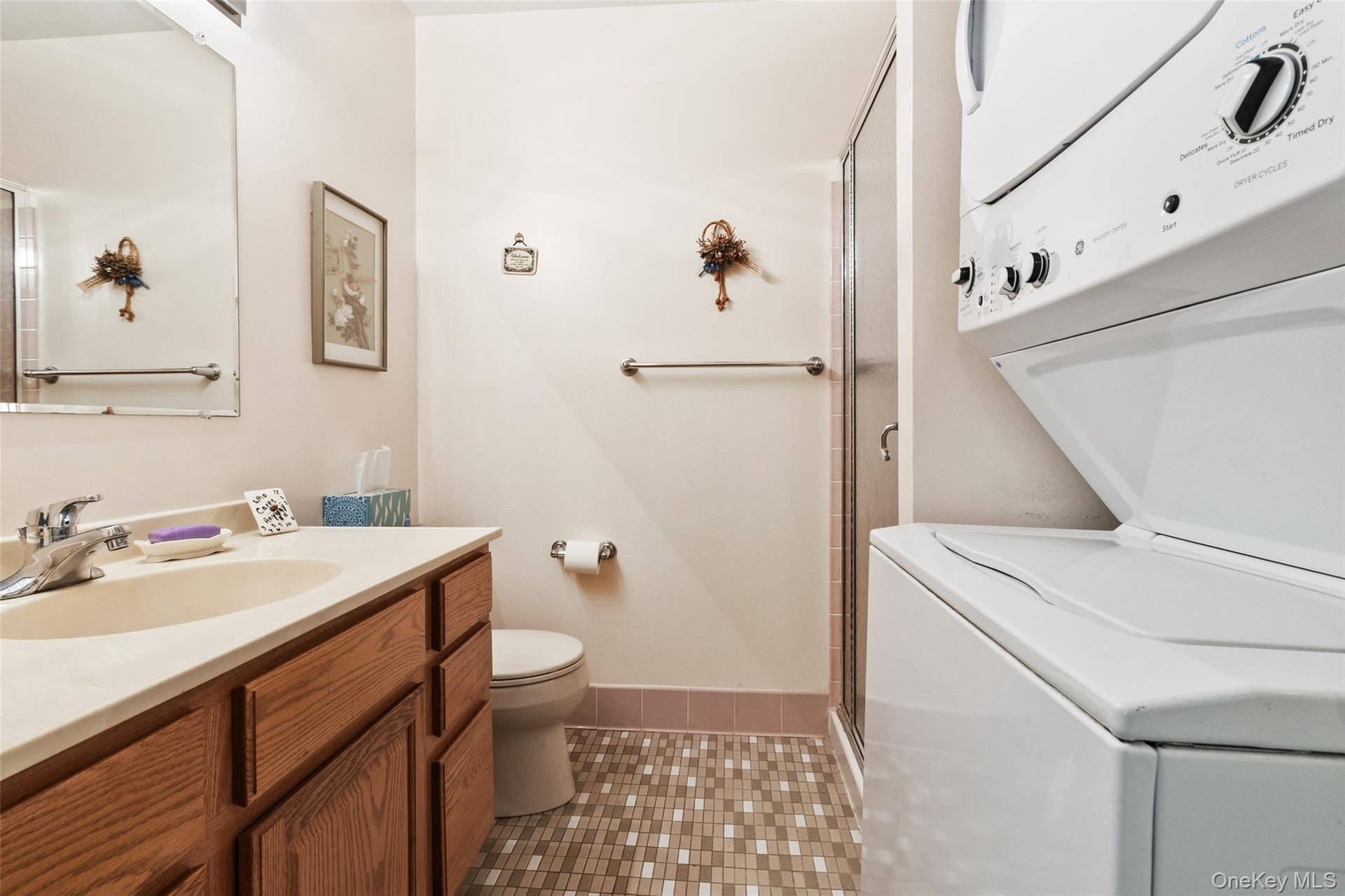 - Full bath featuring vanity, stacked washing machine and dryer, dark tile patterned flooring, and a stall shower