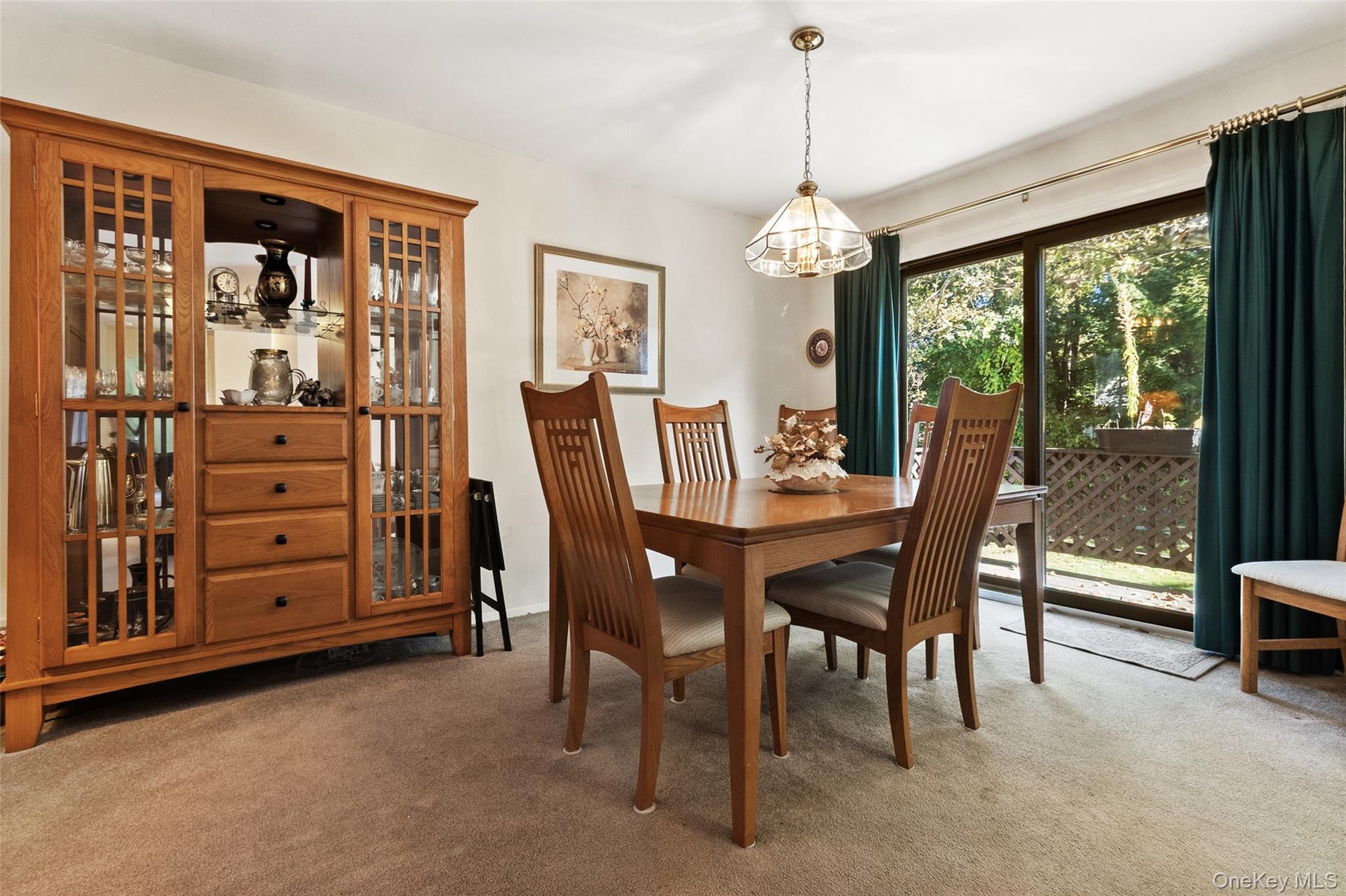 - Dining space featuring light carpet