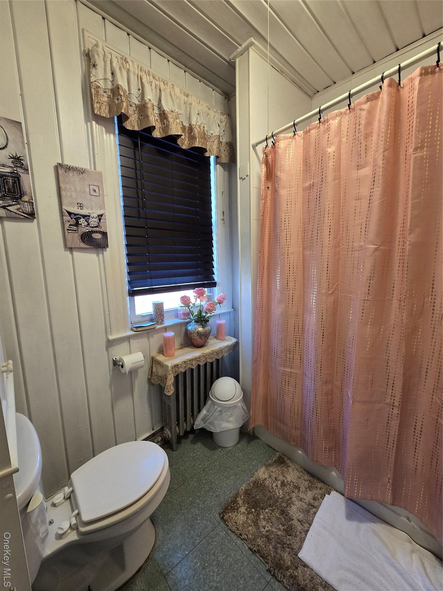 - Bathroom featuring radiator heating unit, toilet, and a shower with curtain
