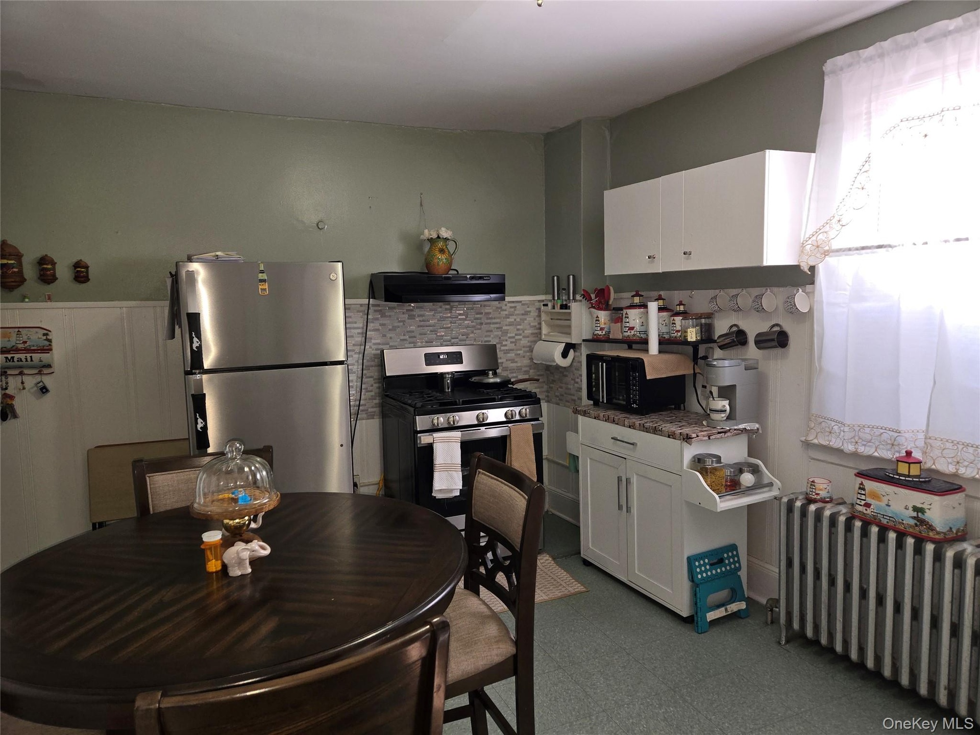 - Kitchen featuring white cabinets, light countertops, radiator, gas range, and backsplash