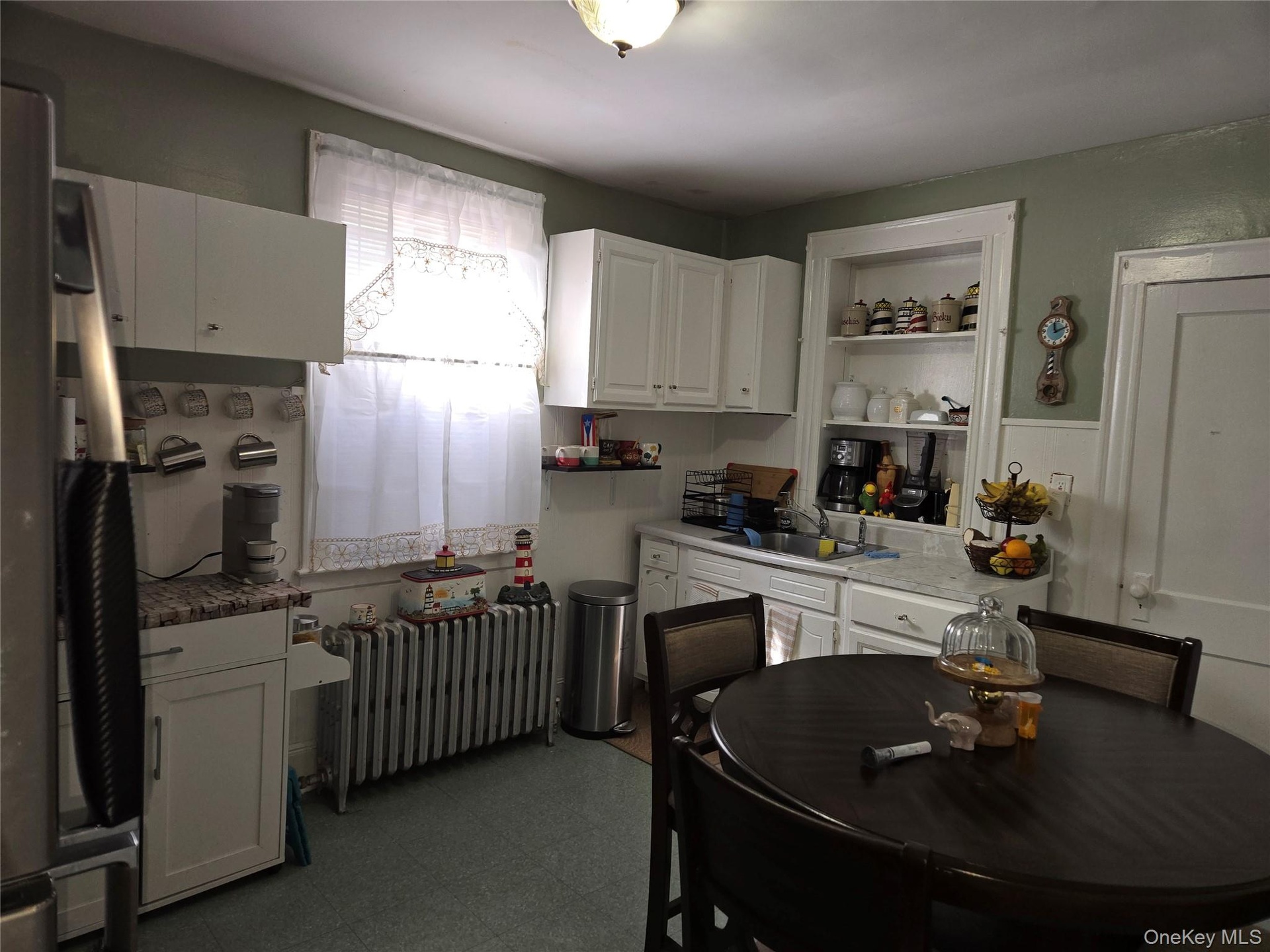 - Kitchen with a sink, open shelves, white cabinetry, radiator heating unit, and light floors