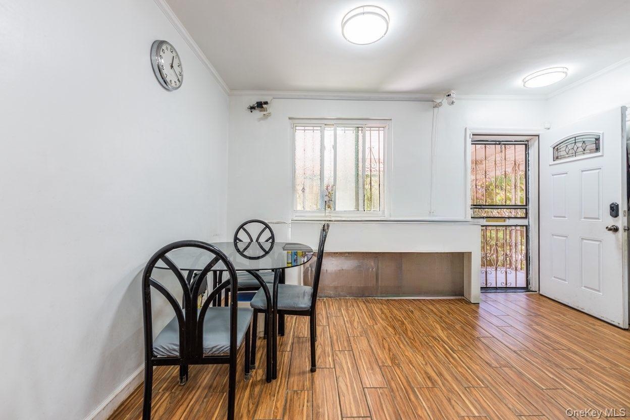 - Dining area with light wood finished floors, crown molding, and plenty of natural light