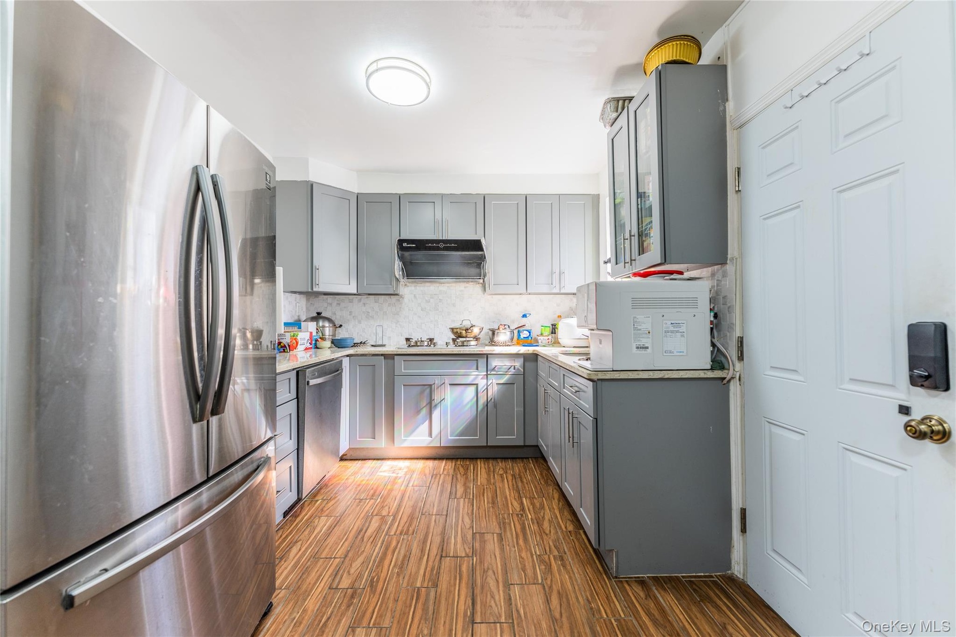 - Kitchen featuring gray cabinets, stainless steel appliances, decorative backsplash, dark wood-type flooring, and ventilation hood