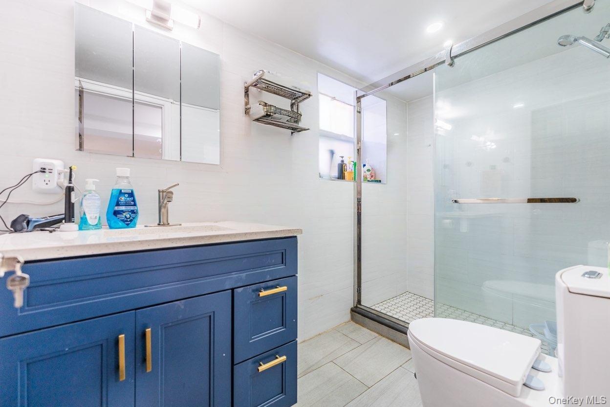 - Full bath with vanity, a shower stall, and light tile patterned flooring