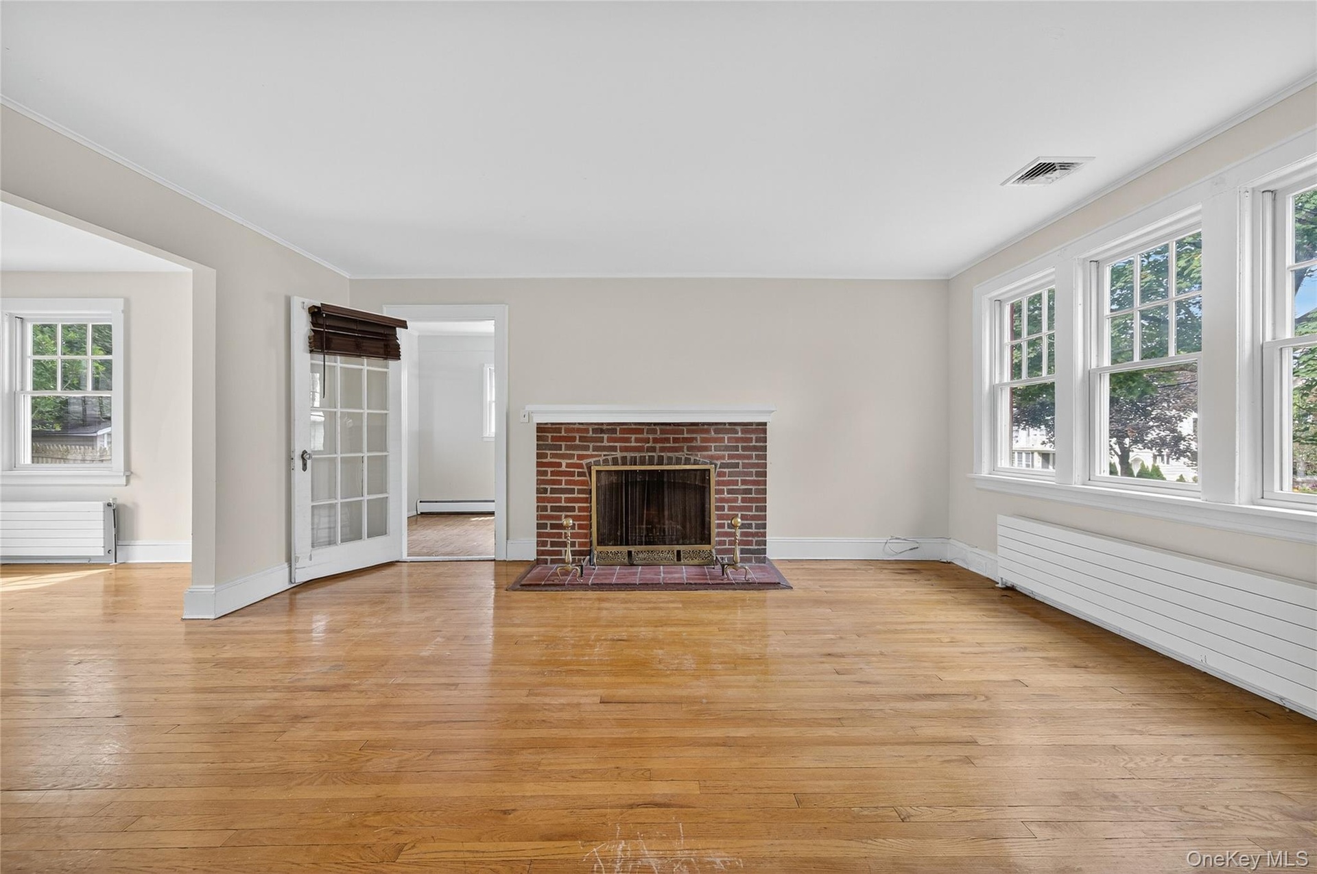 - Unfurnished living room featuring radiator heating unit, a fireplace, light wood finished floors, and healthy amount of natural light