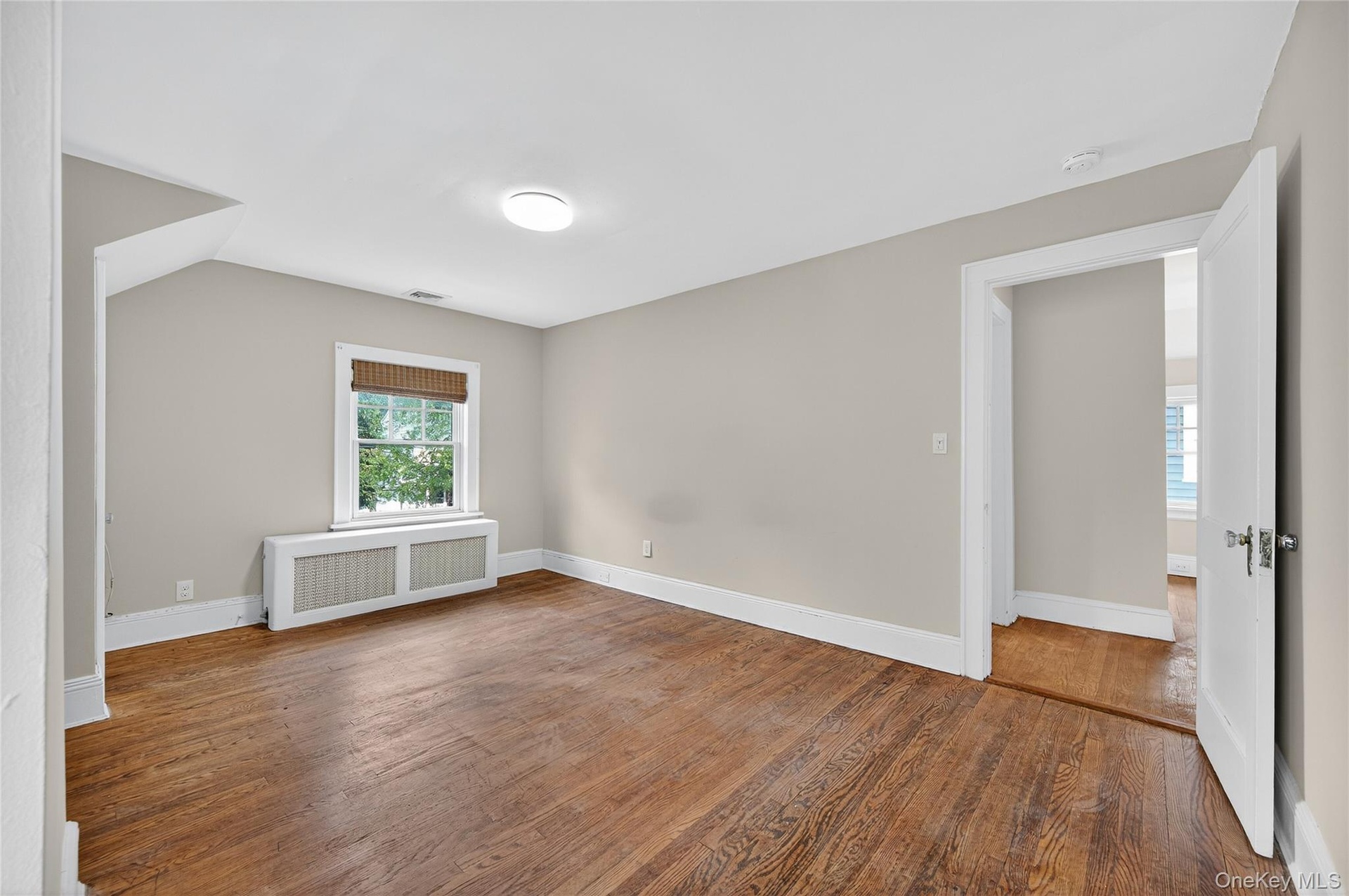 - Unfurnished room featuring wood finished floors and radiator heating unit