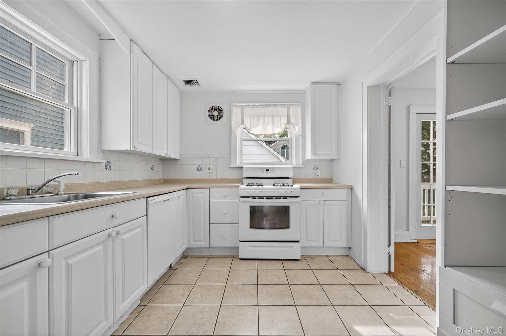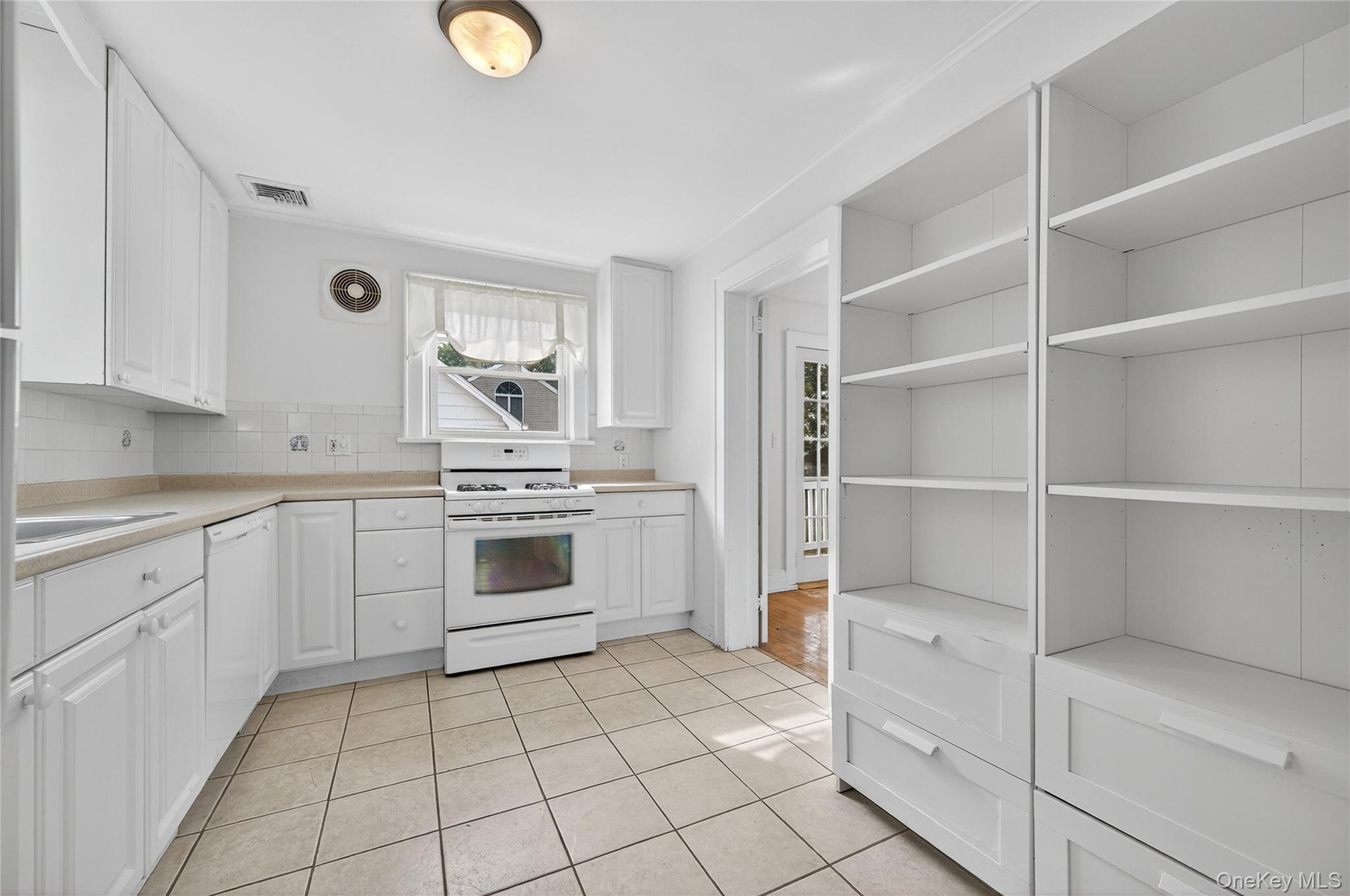 - Kitchen with white appliances, light tile patterned flooring, white cabinets, light countertops, and backsplash