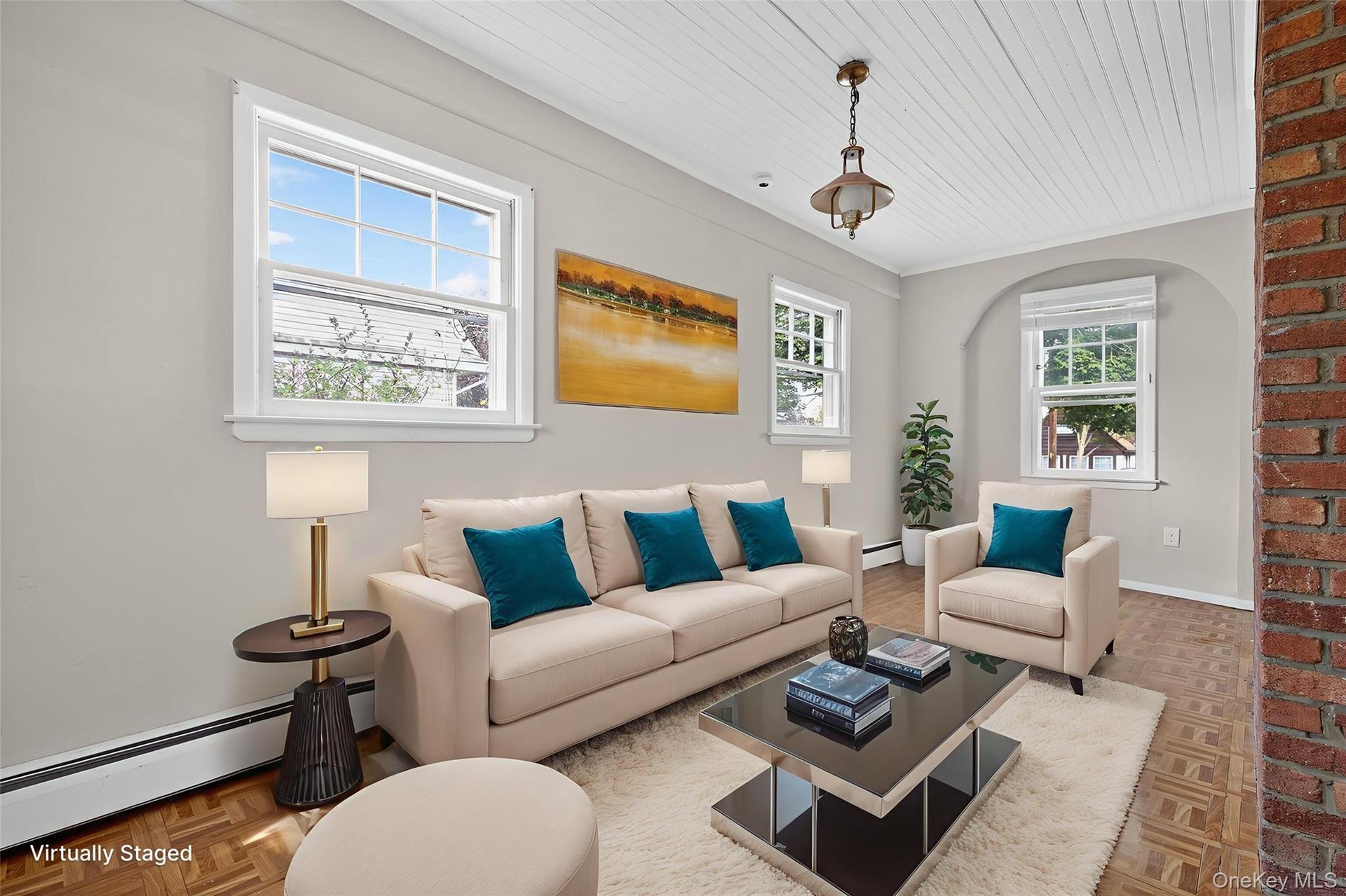 - Living room featuring ornamental molding, a baseboard heating unit, and wooden ceiling Virtually staged