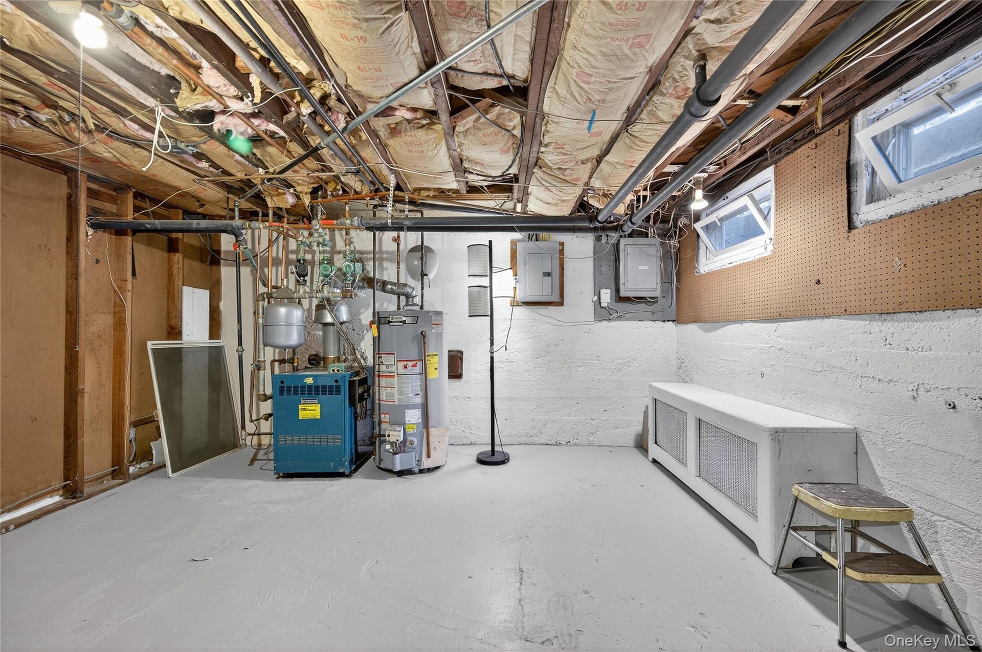 - Basement featuring water heater, a heating unit, electric panel, and radiator