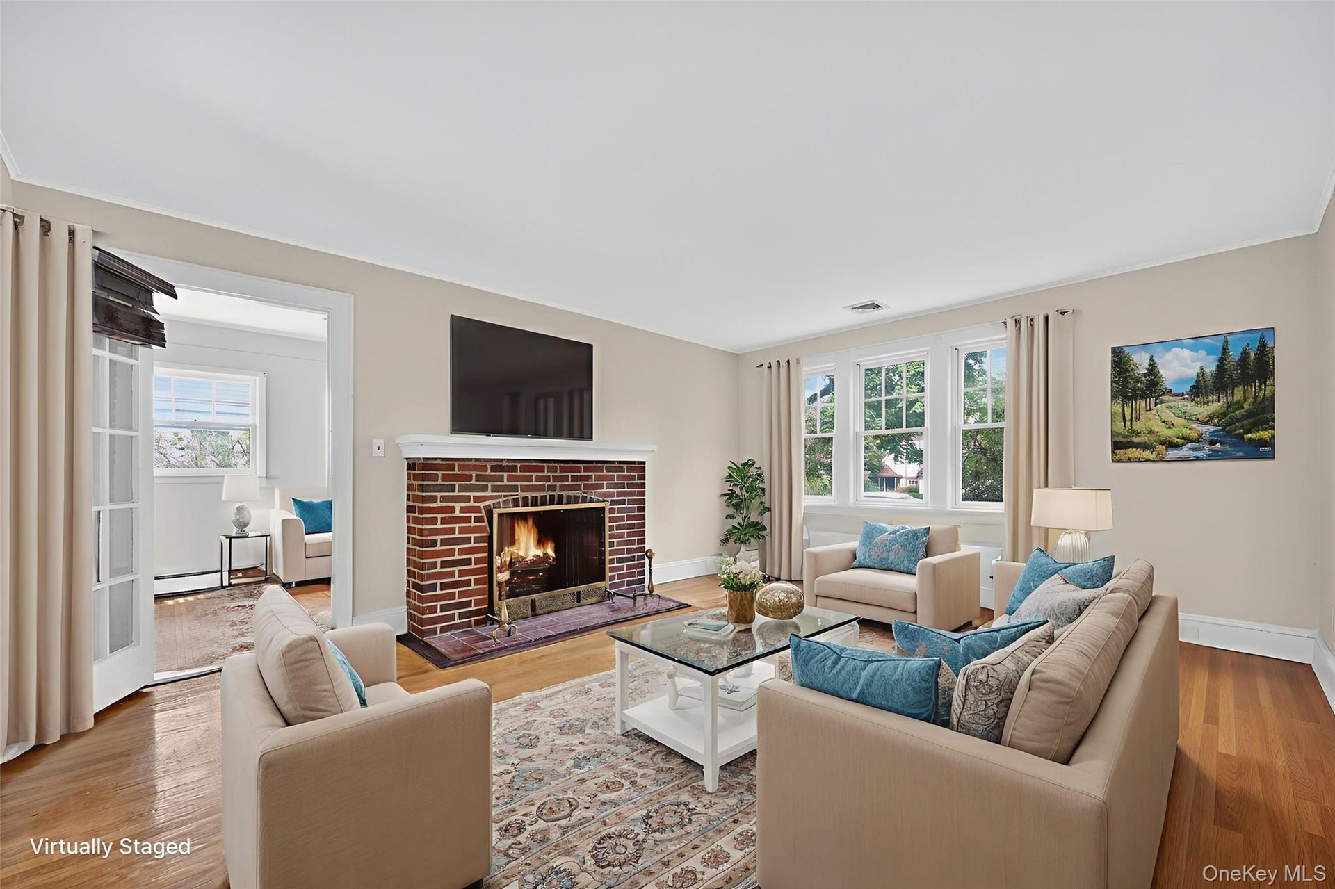 - Living room featuring wood finished floors, a fireplace, and plenty of natural light Virtually staged
