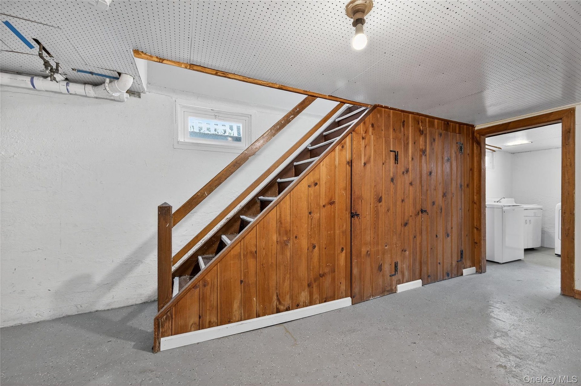 - Below grade area featuring wooden walls, stairs, and washer and clothes dryer