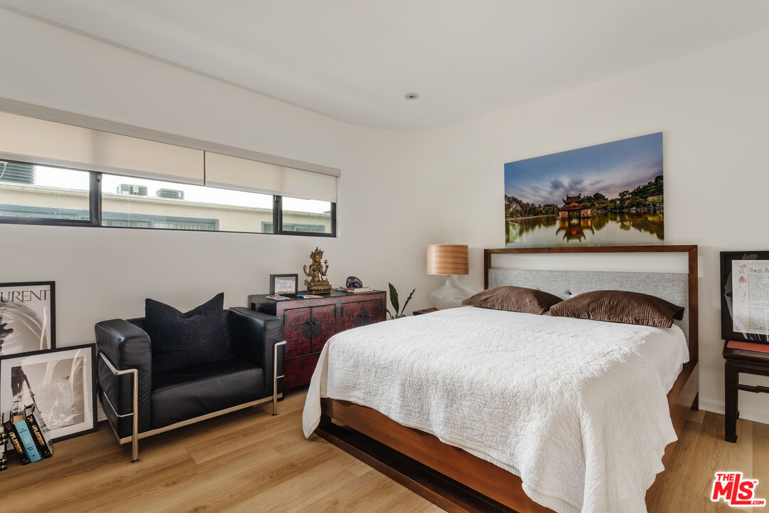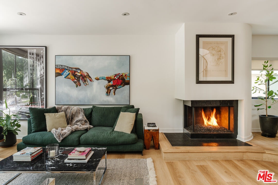 Tucked within one of the few condominium enclaves in the prestigious Bel Air neighborhood, this rare two-level townhome blends architectural style, modern comfort, and serene indoor-outdoor living. One of just seven residences and only sharing one wall with neighbors, the home offers a refined retreat amid a setting typically reserved for grand estates. Upon entry, a light-filled living space welcomes with floor-to-ceiling windows, a sleek gas fireplace, and seamless access to a covered balcony framed by leafy treetops--an idyllic perch for morning coffee or evening repose. The adjacent kitchen makes a striking statement with matte black cabinetry, brushed brass hardware, and quartz countertops, punctuated by Viking double ovens and a dedicated wine fridge. A stylish dining area and a built-in wet bar enhance the lower level, ideal for everything from quiet mornings to lively entertaining. Upstairs, a skylight above the spiral staircase allows radiant natural light to fill the space. A private wood-clad courtyard offers a rare al fresco moment--an intimate outdoor escape just outside the bedroom suites. Both bedrooms are generously scaled and feature en suite baths, providing comfort and privacy. The primary suite is graced with oversized windows and ample storage, while its recently updated bathroom includes a tiled soaking tub beneath a skylight and glass-enclosed shower, creating a spa-like sanctuary. Glass block detailing adds a retro-chic flourish to the upper hall, and a stacked laundry closet offers everyday convenience without compromising design. Ideally located for those who seek privacy without isolation, this Bel Air gem is just minutes from The Getty Center, Brentwood Village, Westwood, and the 405 freeway--pairing tranquil living with effortless access to the best of the Westside.
