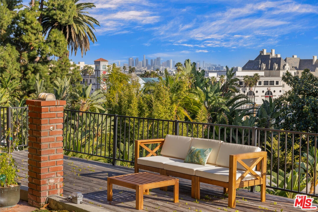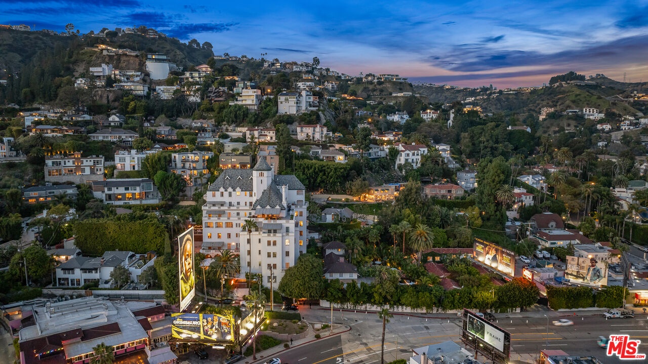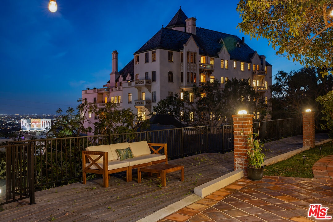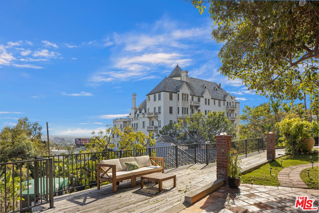 Perched on a beautiful lot above the iconic Chateau Marmont, this splendidly proportioned two-bedroom home is primed for both comfortable living and exceptional entertaining. The expansive, sunlit living room is framed by paned French doors that open seamlessly to the deck, while the dining room boasts dual built-in wine storage areas perfect for the collector or entertainer. The chef's kitchen features wood countertops, stainless steel appliances including double ovens and two dishwashers, and a large central island for gatherings. Upstairs, two master-sized bedrooms each offer en-suite bathrooms with luxurious soaking tubs; one enjoys a private deck with sweeping views. Outside, the home's bohemian spirit shines. A one-of-a-kind outdoor entertaining area is artfully designed with a gallery of mirrors, soaring sails, and expansive decks that capture vistas stretching from Downtown Los Angeles to the Westside. With a 2-car garage and the rare opportunity to acquire the adjoining lot together totaling over 14,000 square feet this offering presents the chance to create an iconic double-lot compound. Architectural plans by renowned Japanese architect group OSO envision a world-class oasis, making this a builder's dream in a location that is nothing short of legendary. In addition to being a spectacular primary residence, the property also functions as an outstanding rental or Airbnb opportunity, with its iconic location, flexible entertaining spaces, and furnished turnkey appeal.