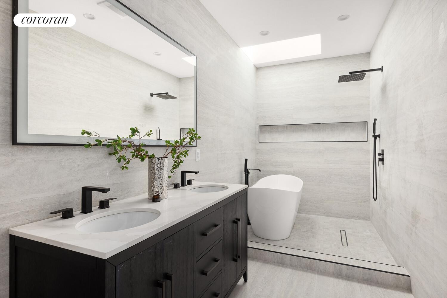 Upstairs, the proportions are just as impressive - with 10 foot ceilings. The primary suite spans the width of the house, with two closets-including a fully finished walk-in-and a spa-like bathroom with a separate soaking tub and a skylight overhead. Another skylight brightens the hallway, so the entire top floor is basked in natural light. Two additional bedrooms, a laundry closet, and a linen closet make this level as functional as it is beautiful.