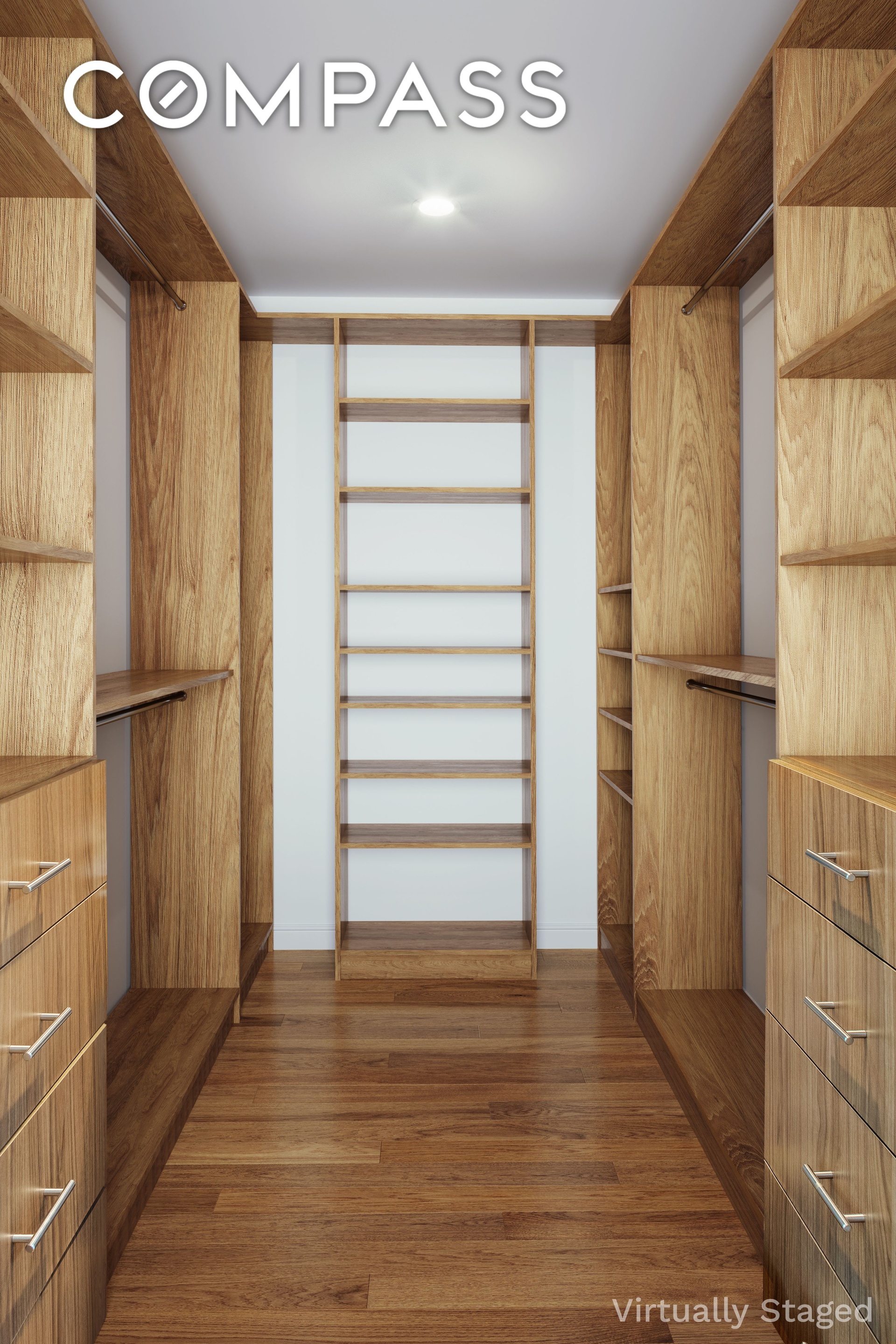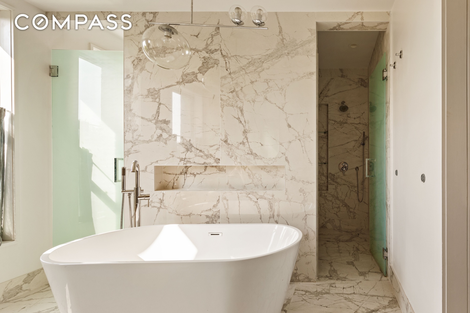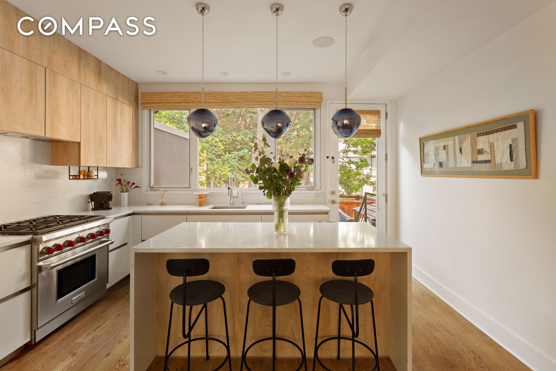 The parlor floor in the owner’s triplex features an airy great room that is perfect for entertaining. A stunning open floor plan connects living, dining, and culinary spaces that flow seamlessly onto an oversized deck. The showstopper kitchen centers on a massive island outfitted with custom German Bauformat cabinetry, striking surfaces, Tom Dixon lighting and top-tier Wolf and Sub-Zero appliances that will inspire your inner chef.