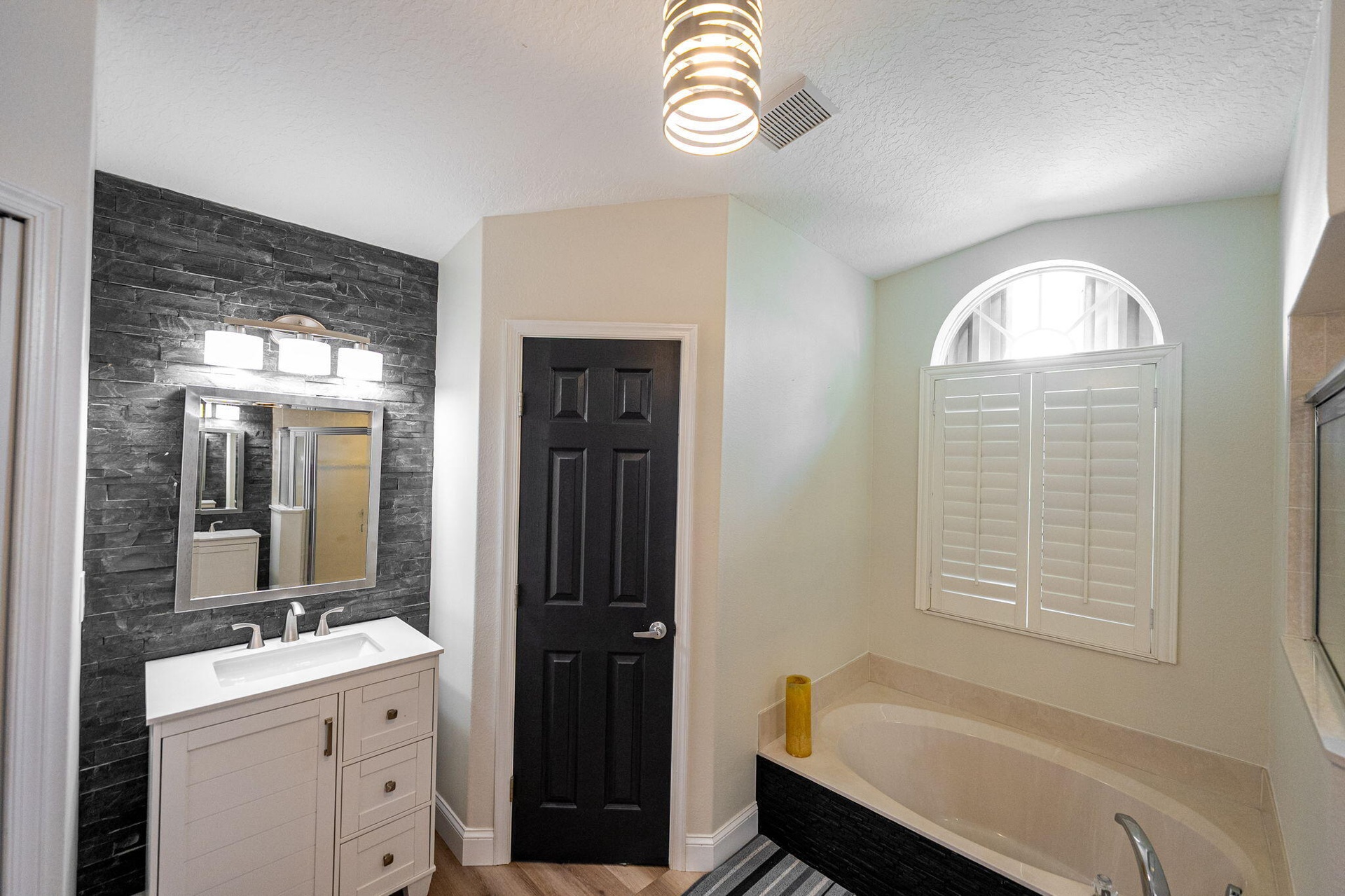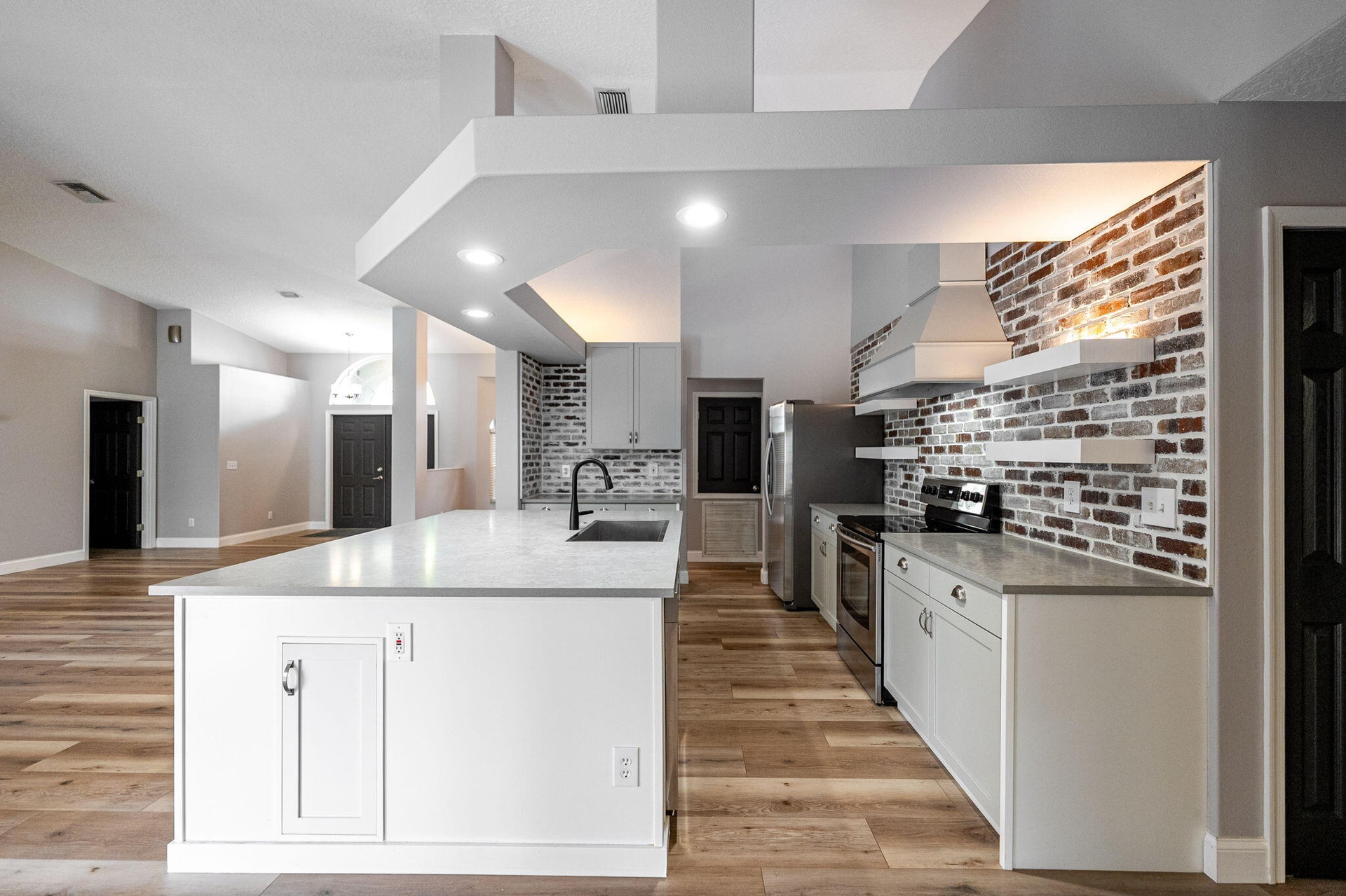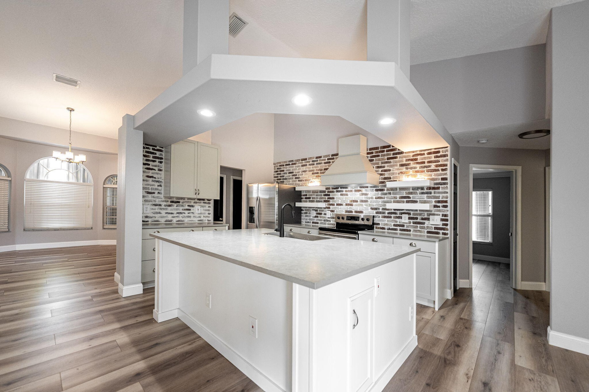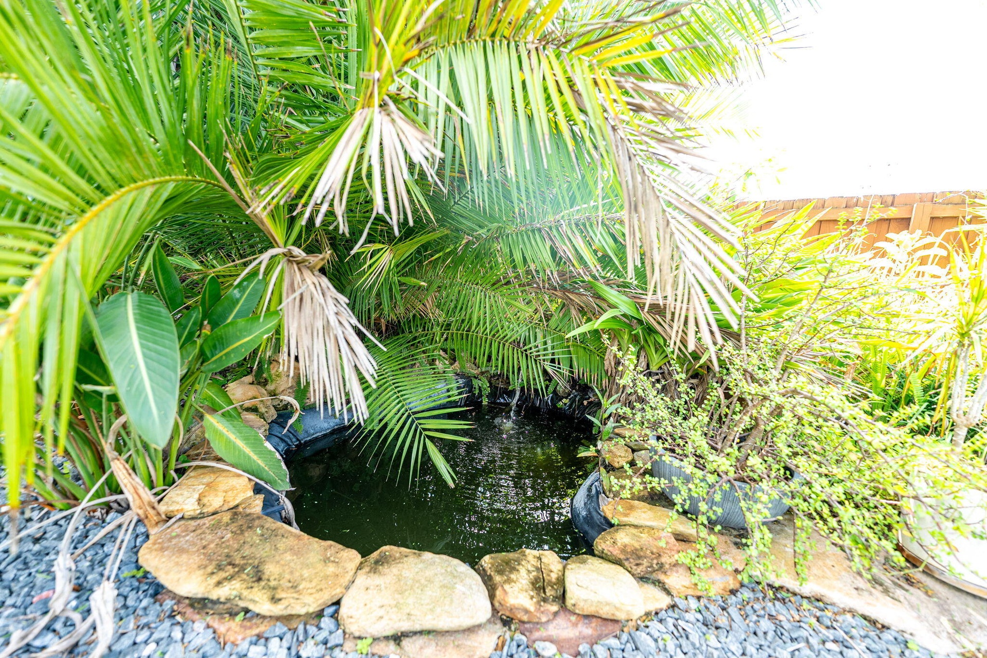 Discover this distinctive 3-bedroom, 2-bath, CBS home, with an attached 2-car garage, on a quiet street in the highly desirable Torino neighborhood. This property shows like a model with an inviting, wide-open floor plan, split-bedrooms and beautiful wood laminate flooring throughout every room. The well-appointed gourmet kitchen has been stylishly updated with quartz countertops, stainless steel appliances, and grey cabinets. You will love the designer Plantation Shutters and crown molding. A newer metal roof was installed in 2022, and the AC system was replaced in 2016. The large screened patio opens to a lushly landscaped, fenced backyard, deck and tranquil outdoor space with koi pond and BBQ area. Top location convenient to shopping, schools, access to I95 and area beaches.