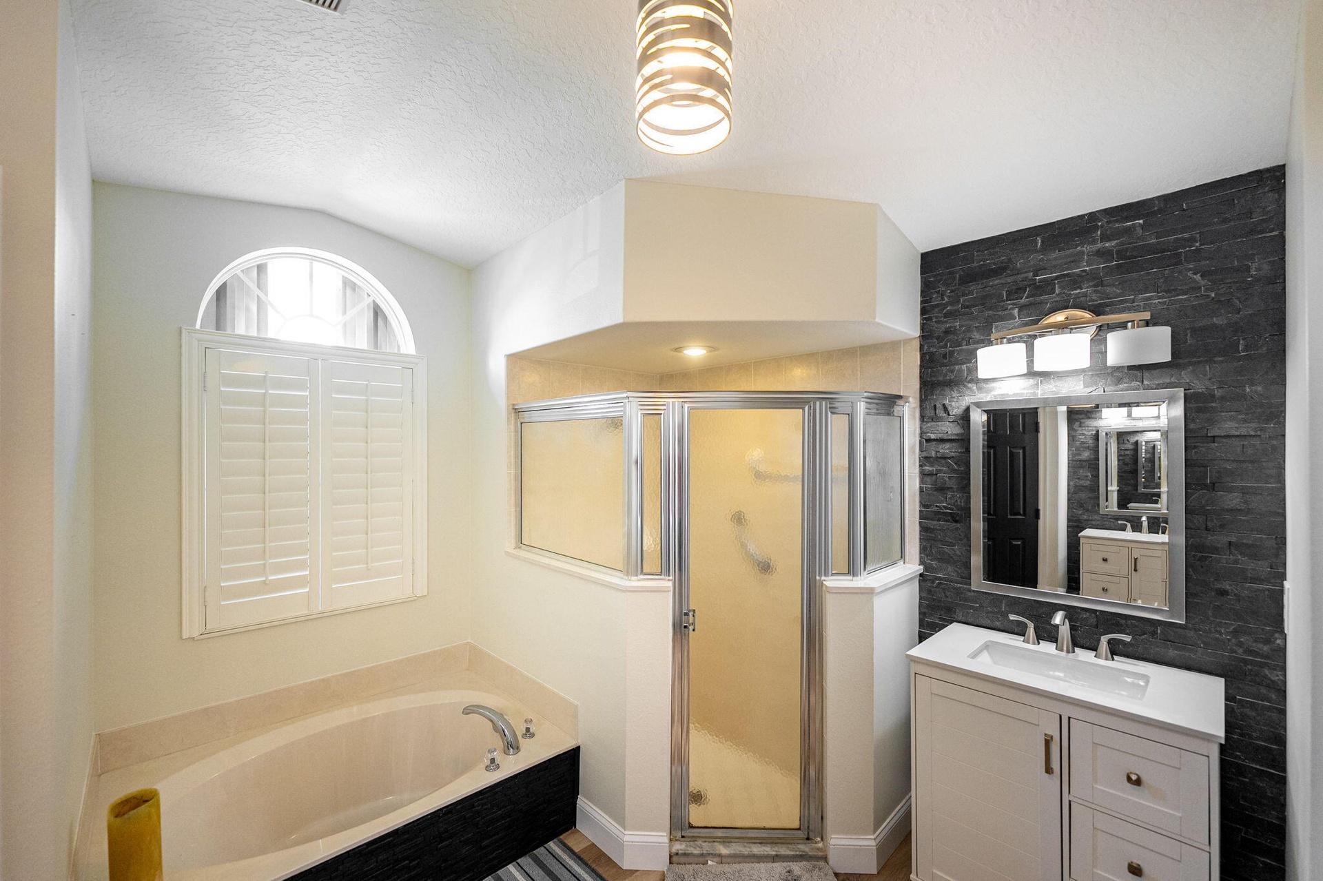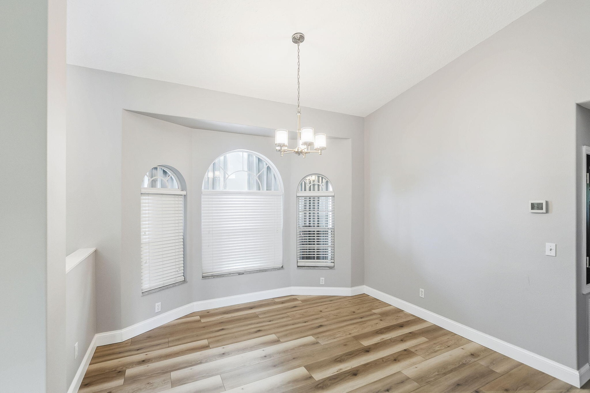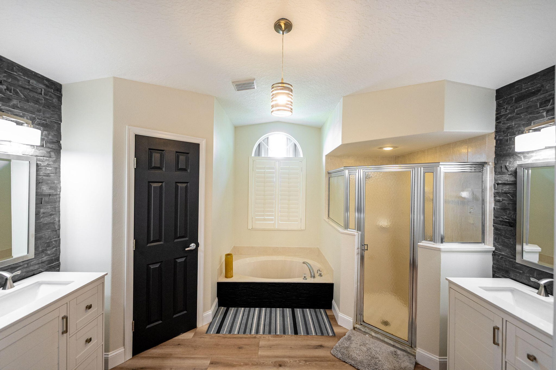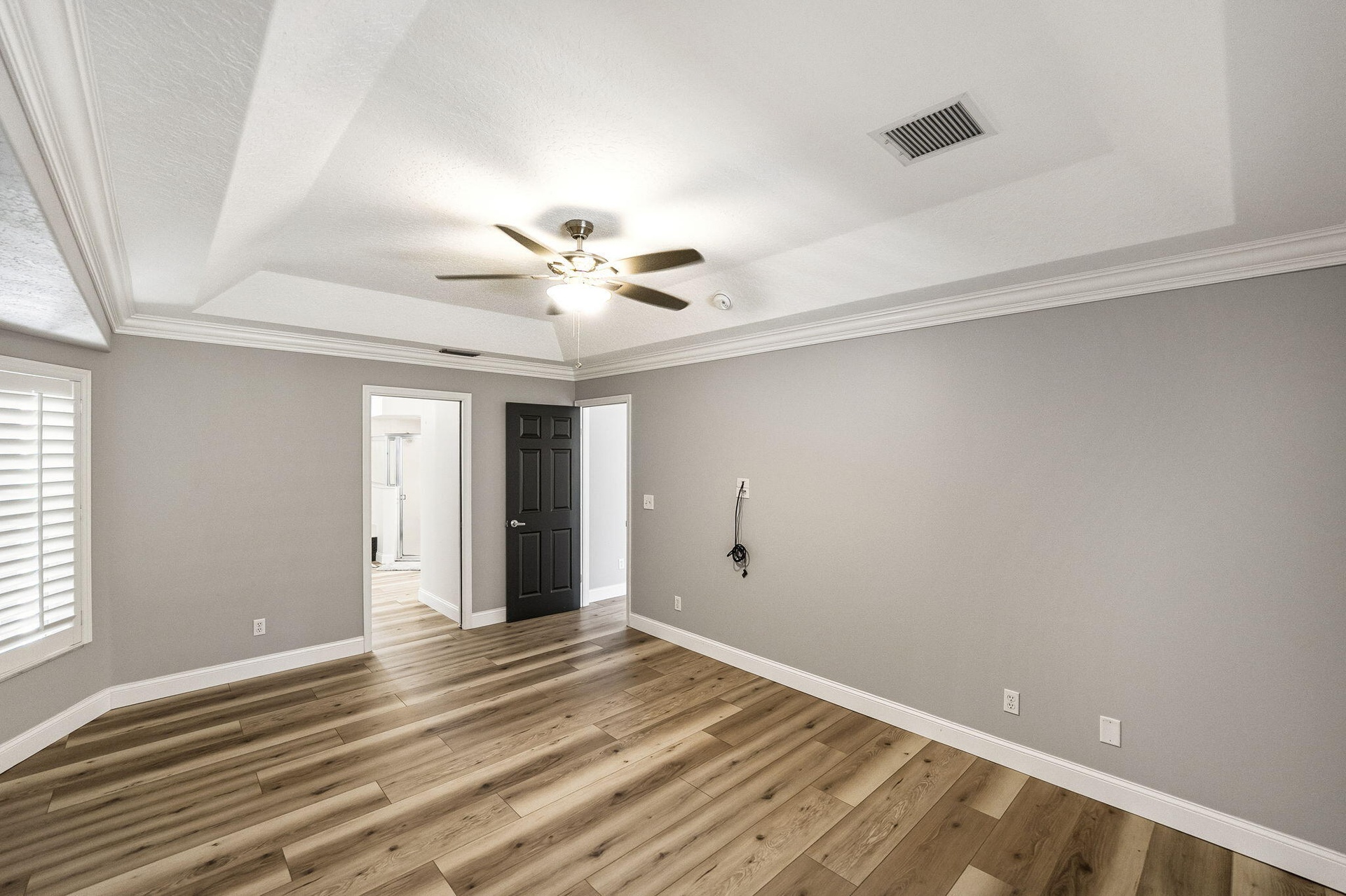 Discover this distinctive 3-bedroom, 2-bath, CBS home, with an attached 2-car garage, on a quiet street in the highly desirable Torino neighborhood. This property shows like a model with an inviting, wide-open floor plan, split-bedrooms and beautiful wood laminate flooring throughout every room. The well-appointed gourmet kitchen has been stylishly updated with quartz countertops, stainless steel appliances, and grey cabinets. You will love the designer Plantation Shutters and crown molding. A newer metal roof was installed in 2022, and the AC system was replaced in 2016. The large screened patio opens to a lushly landscaped, fenced backyard, deck and tranquil outdoor space with koi pond and BBQ area. Top location convenient to shopping, schools, access to I95 and area beaches.